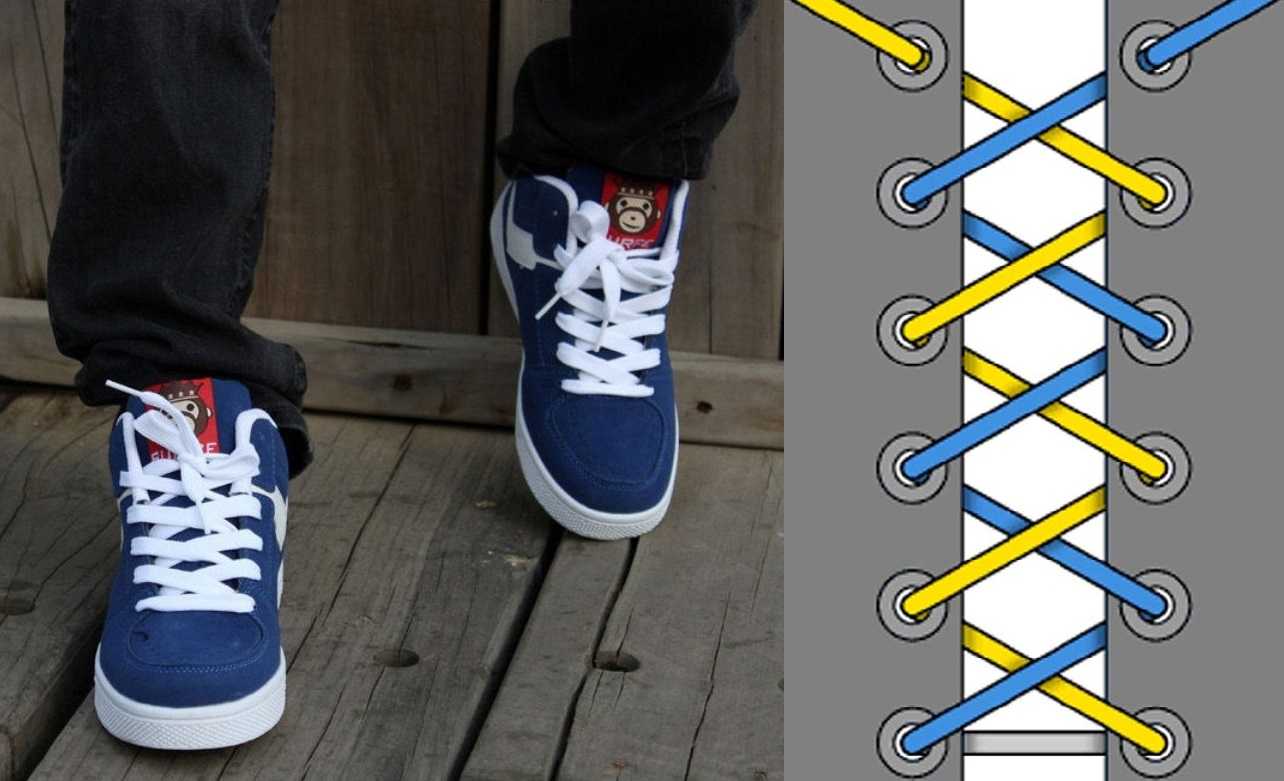 Этот вариант подходит людям с высоким подъемом, которые испытывают дискомфорт при длительной ходьбе или занятиях спортом. Для начала шнурок вставляется в петельки изнутри, перекрещивается и снова вставляется в петельки. Потом при необходимости делается пропуск — концы вертикально протягиваются в следующий по счету ряд, снова образуя крест. Пропуск можно сделать как ниже, так и чуть выше.