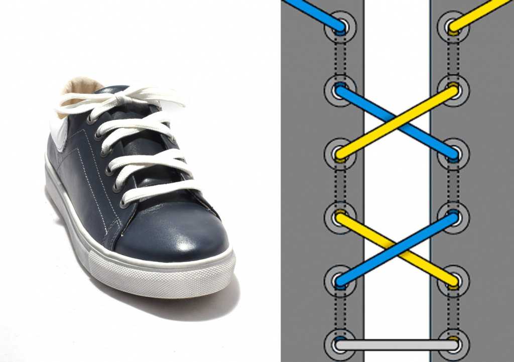 Шнурки продеваются через каждую дырку, начиная снизу и двигаясь вверх. Затем они пересекаются между двумя верхними отверстиями, создавая крестообразный рисунок, и завязываются в обычный узел