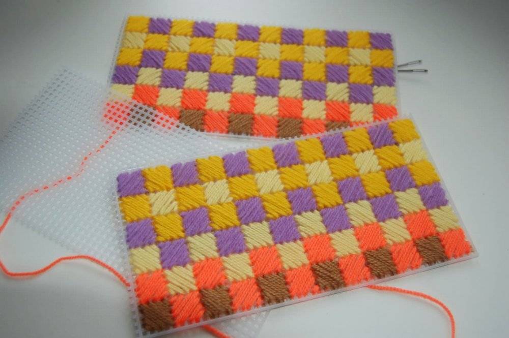 Плоские изделия, вышитые на пластиковой канве, следует делать двусторонними или закрывать изнанку фетром, тканью, бархатной бумагой. Задник спрячет конец рабочей нити и все узелки.