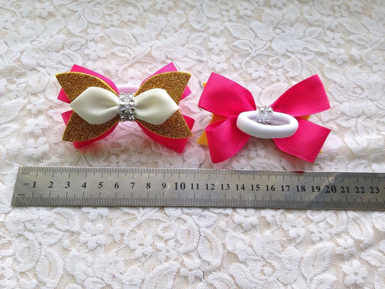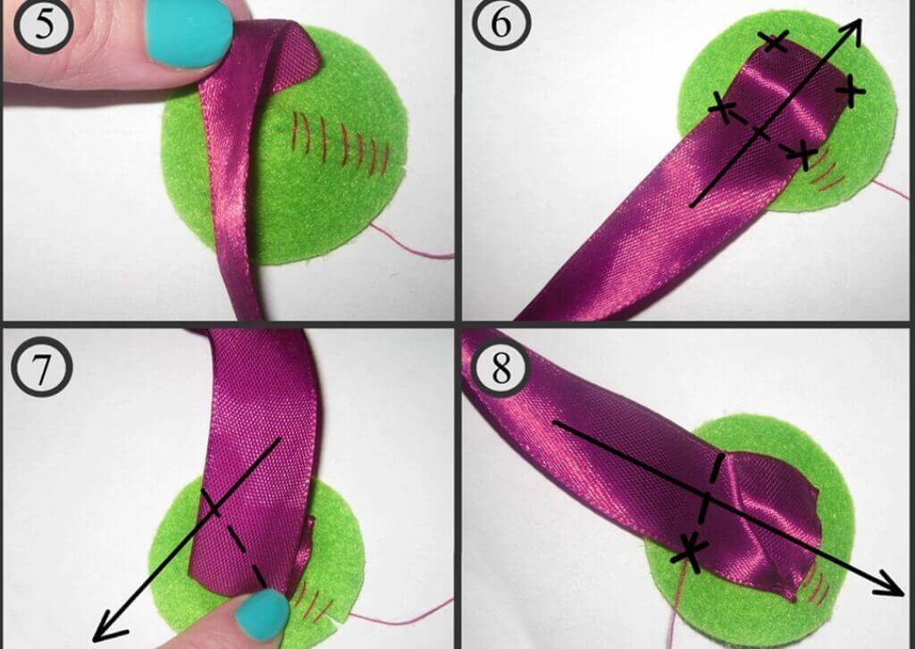 Каждое украшение для резинки или заколки состоит из пропорциональных лепестков или бантиков, соединенных на фетровом кружке, к которому заранее приделывается заколка или вшивается резинка. При этом также может применяться ажурная или перфорационная лента для создания красивого и пышного банта.