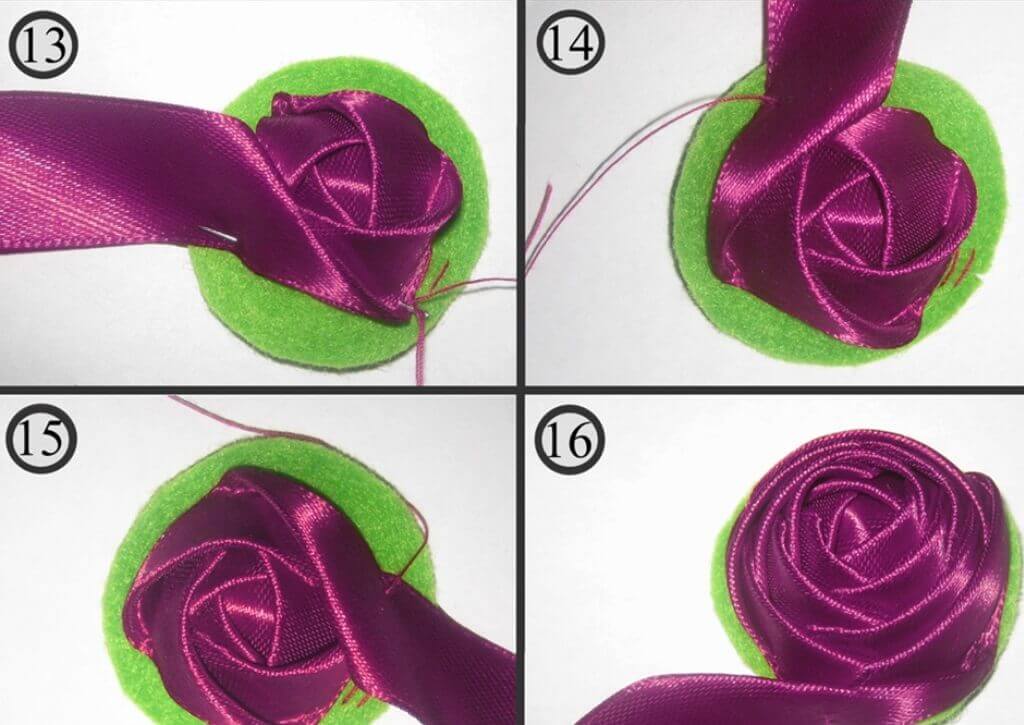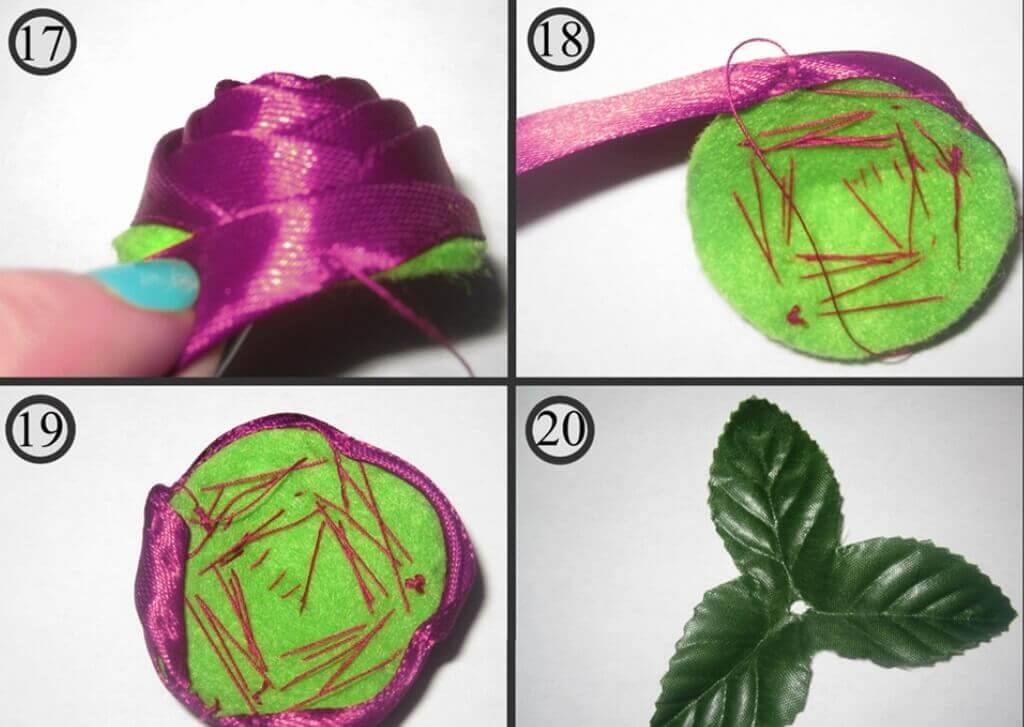 Когда остаётся небольшой конец ленты – окантовываем край, загибая ленту на основу (рис. 18). Вот так выглядит основание розы. Листья можно сделать из фетра, можно вместо листьев пришить кусочек кружева. Вот и готова наша роза, а закрепить её на ободке удобнее вот так, чуть надрезав основание: