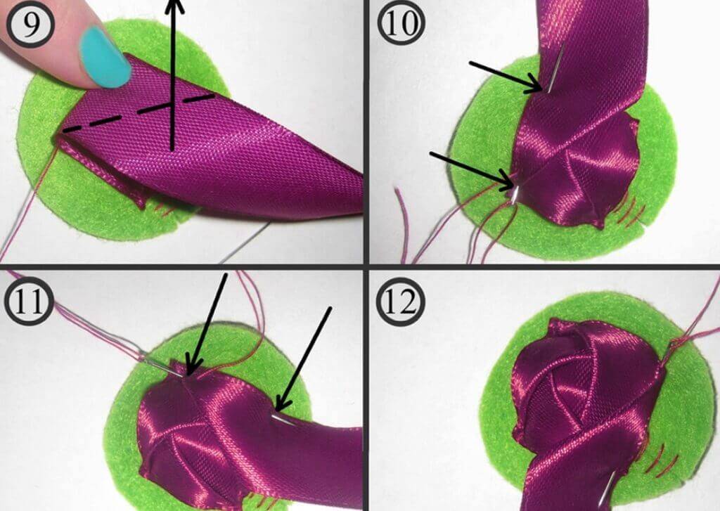 Затем опять накладываем ленту на готовый элемент и загибаем по пунктирной линии (рис. 9). Пришиваем 2 угла по стрелке (рис. 10), ещё 2 угла (рис. 11), и ещё 2: показано, как лучше держать иглу (рис. 12).