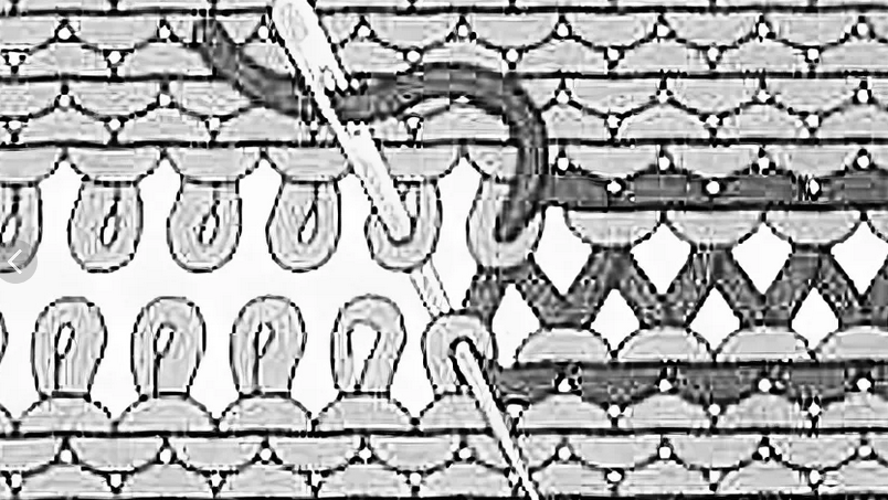 а) Используется для соединения деталей чулочного вязания за открытые петли. Не нарушает структуру вязаного полотна и сохраняет его эластичность. При сшивании швом “петля в петлю” на полотне всегда образуется дополнительный ряд. Если, например, вяжут узор с раппортом в 4-ре ряда, то на одной детали вяжут два ряда (видим готовый ряд и ряд на спице), а на второй детали вяжут только 1 ряд, петли на спицах при соединении дадут нам 4-й ряд раппорта. Открытые петли обеих деталей располагают друг против друга и сшивают их справа налево по лицевой стороне нитью того же цвета и толщины, которой вязали детали. Для этого: