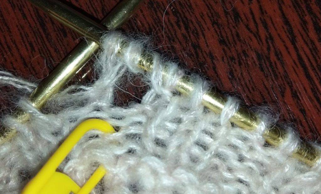 - Вяжу опять в сторону бокового шва, не довязываю еще 5 петель, разворачиваюсь. И так 5 раз, пока не дойду до маркера.