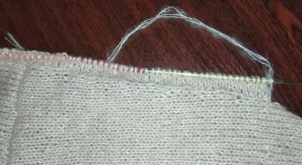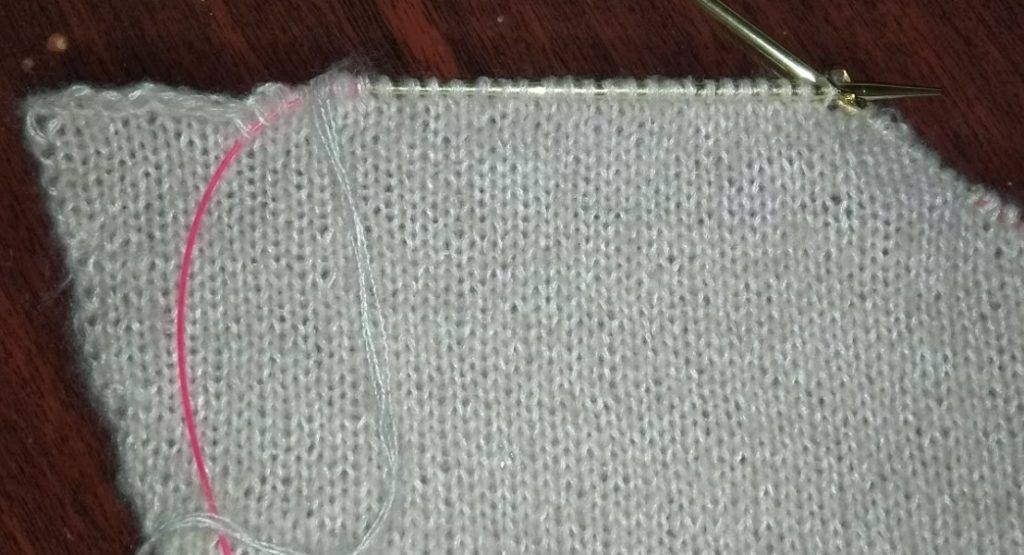 - Затем провязываю полный ряд и вяжу до уровня проймы. Здесь мне нужно снова, как и в спинке, прибавить на линию проймы приспущенного рукава 7 петель.