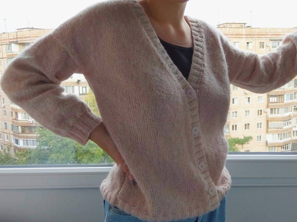 Давно я планировала связать дочери нечто воздушное, но у молодежи ажуры сейчас не в почете, а вязаную кофту на пуговицах она хотела. Я слегка видоизменила модный тренд – горловина V-образная, приспущенный рукав и никаких ажуров, только лицевая гладь.