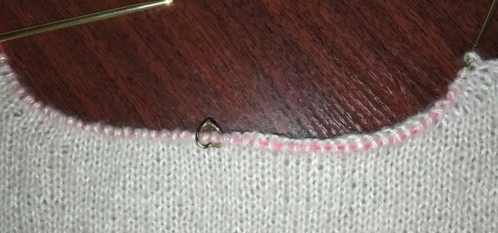 Центральные петли выреза горловины отмечаются особенным образом, эти маркеры подскажут вам, на каком уровне располагать вырез на лицевой части. Остаточные петли закрываются.