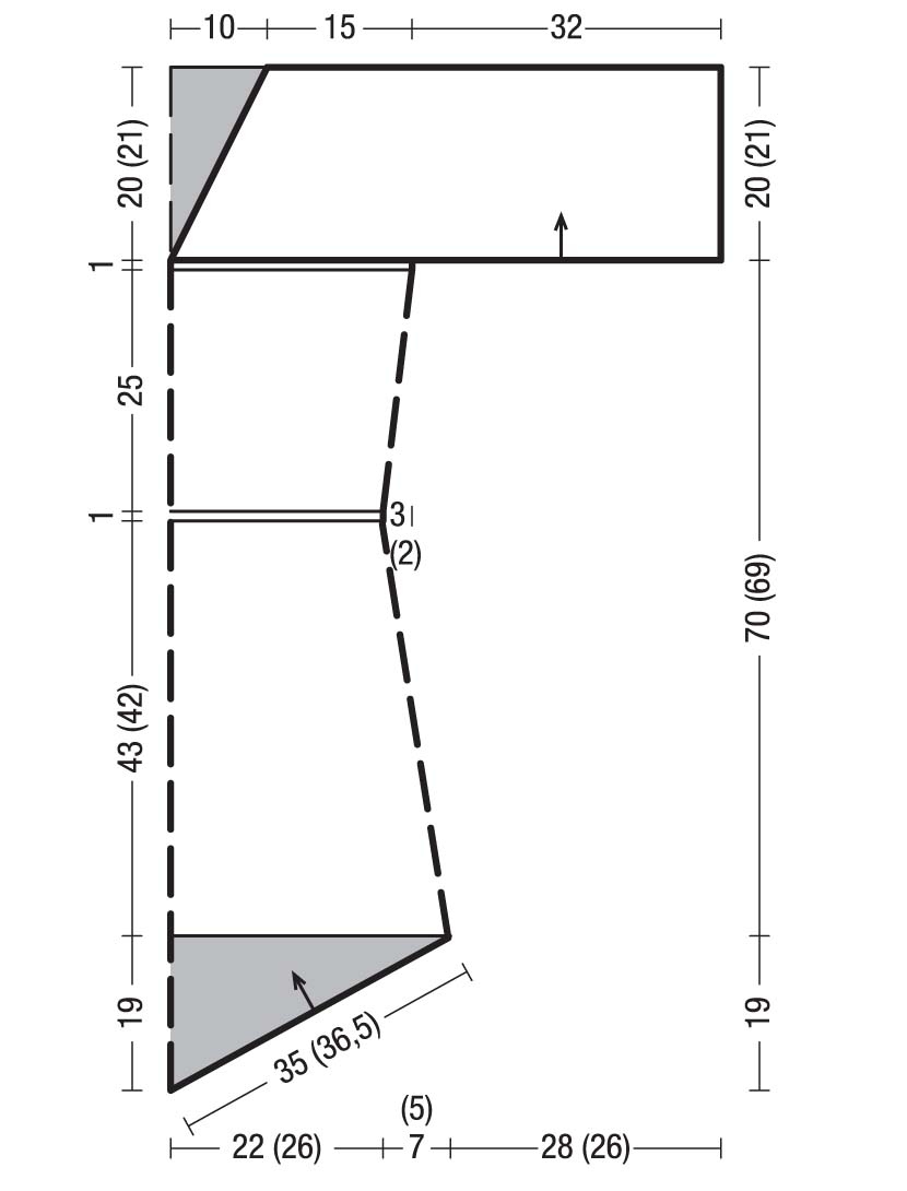 Перед вязать, как спинку, но для более глубокой горловины уже через 62 см = 176 рядов от начального ряда оставить средние 14 (20) 26 п., затем в каждом 2-м ряду подчеркнуто убавить 12 раз по 1 п.