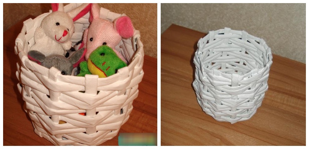 Есть еще один более простой вариант: трубочки не нужно скручивать, их много раз мелко складывают вдоль, чтобы получились подобия толстых ленточек одинаковой ширины. Далее из них можно делать плетенку – это отличная основа для дна и стенок. Такой способ легче скручивания, но смотрится не менее оригинально.