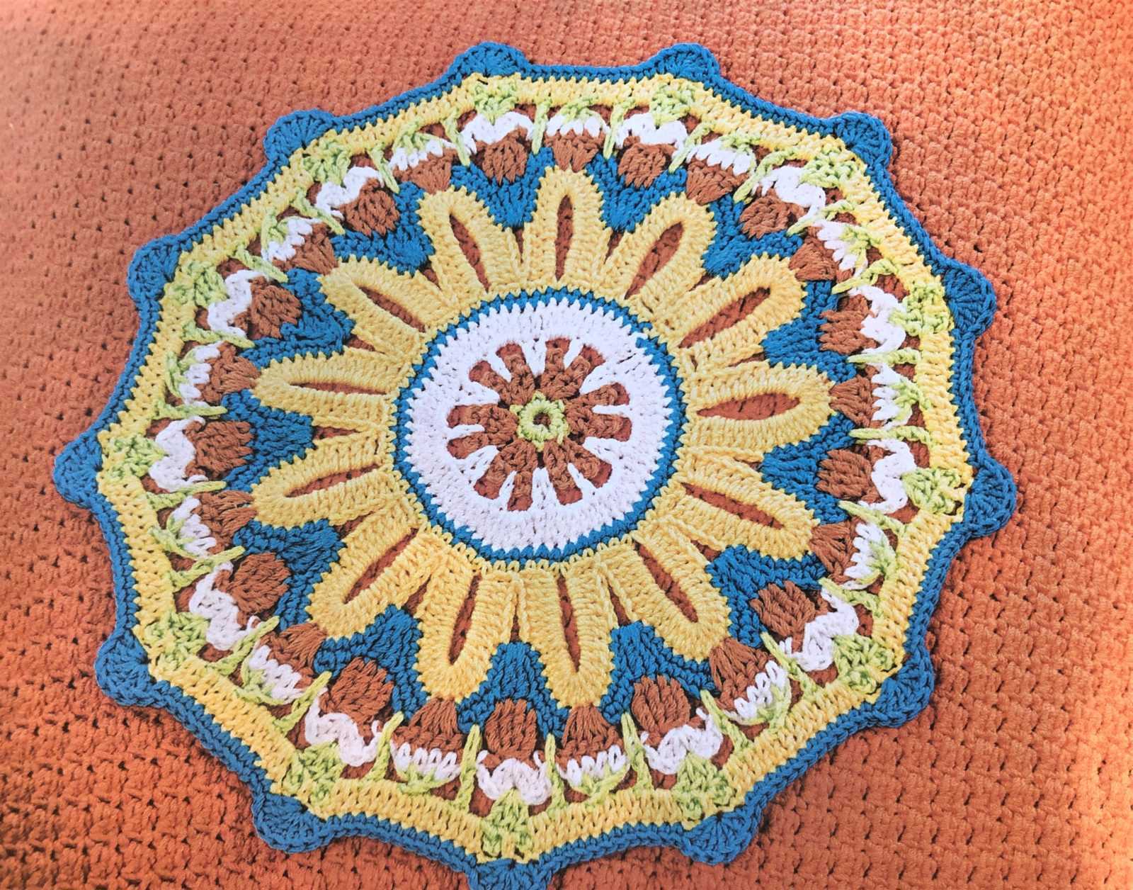 Мандалу пришить посередине передней стороны. Затем отвернуть нижнюю и потом верхнюю тыльную сторону назад изнанкой налицо, сложив припуск под застежку внахлестку.