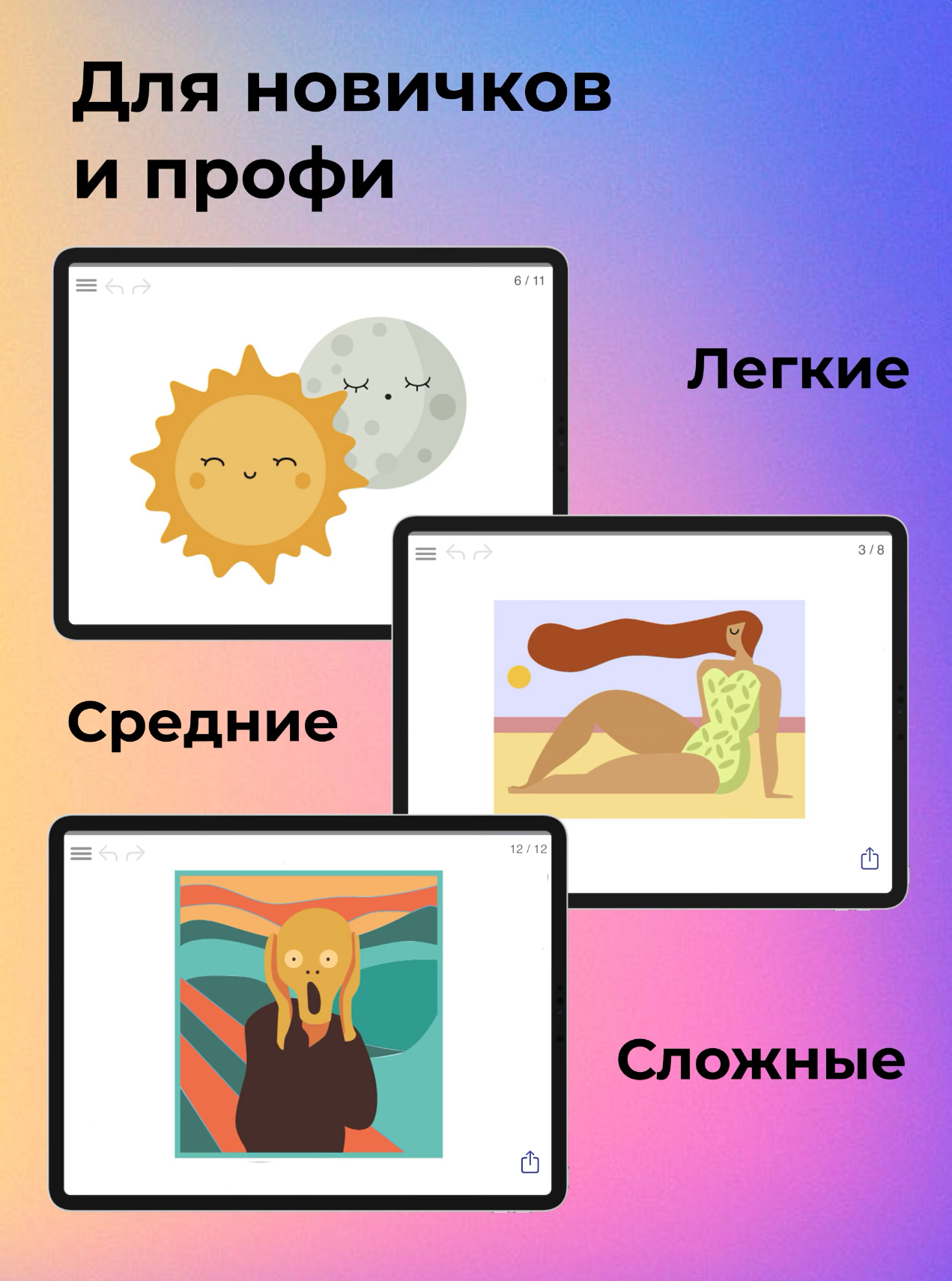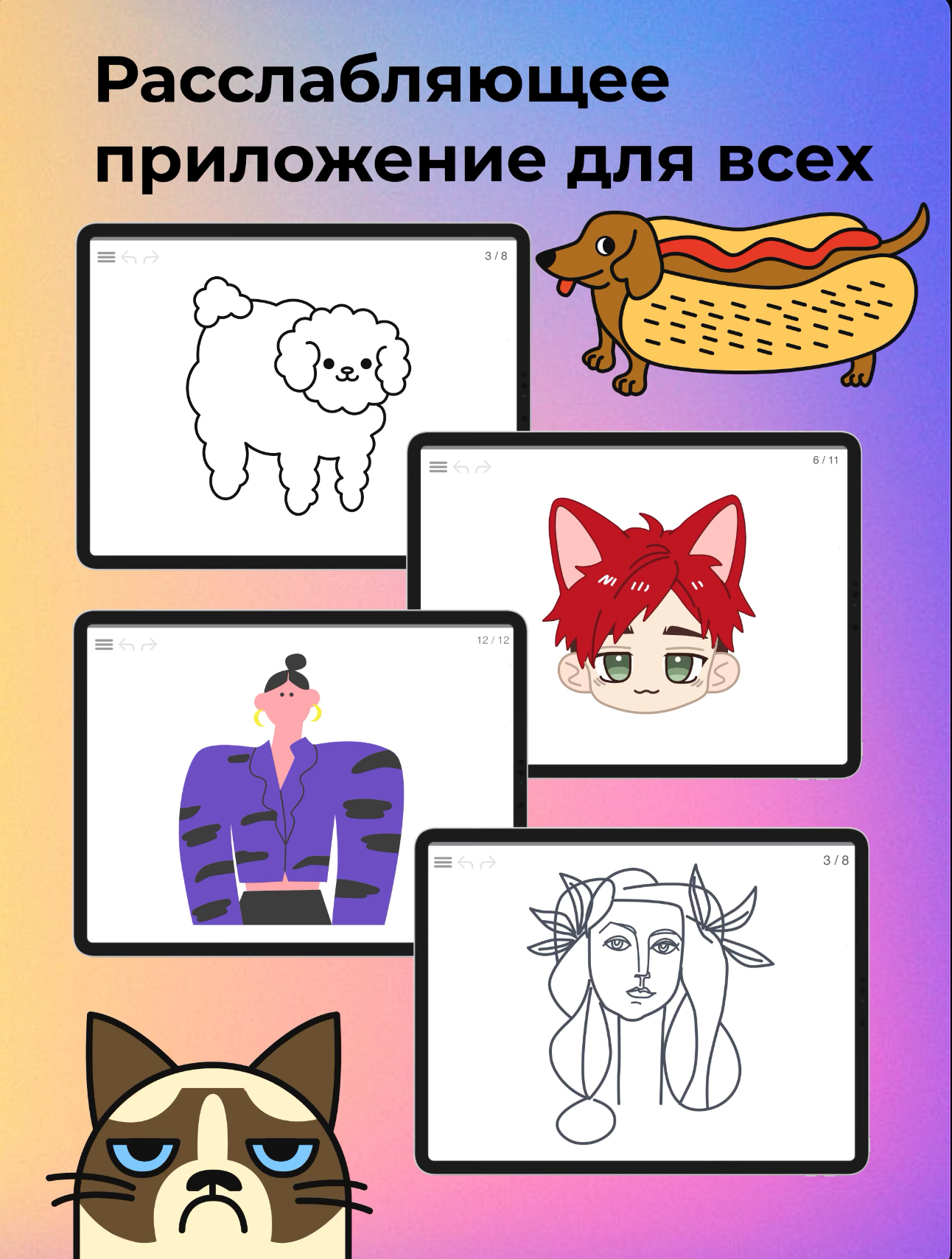 Приложение с пошаговым обучение рисования простых эскизов: животных, цветов, эмоджи.