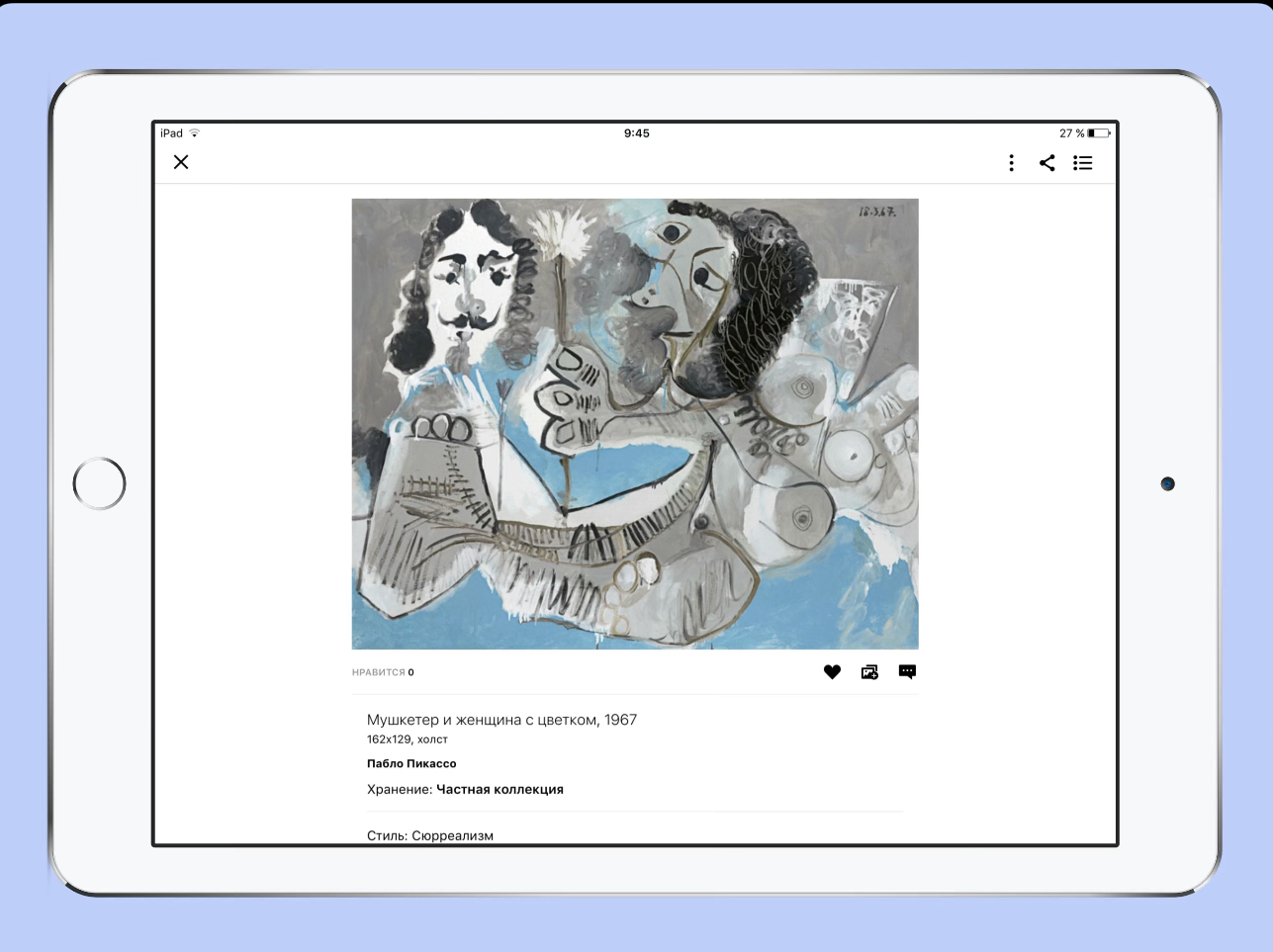 Сможете ли вы отличить рококо от барокко, а Мане от Моне? В этом приложении этому можно научиться, проверяя знания в игровой форме, соревнуясь в батлах, играя с друзьями, отвечая на вопросы викторины. Любуйтесь картинами и изучайте истории из жизни художников. А ещё можно каждый день вдохновляться новым произведением с помощью функции «картина дня».