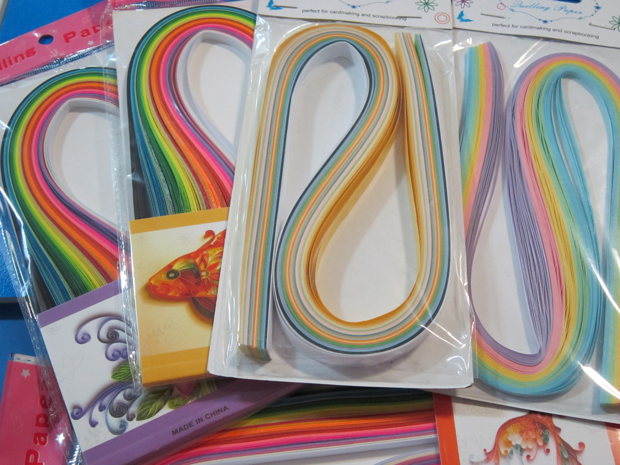 В магазинах продаются специальные наборы с заранее придуманным узором и подготовленным материалом. Необходимо просто сделать все по инструкции. В продаже так же существуют нарезки бумаги различных расцветок. Стандартные размеры одной полоски — 3 мм, 5 мм, 7 мм, 10мм.