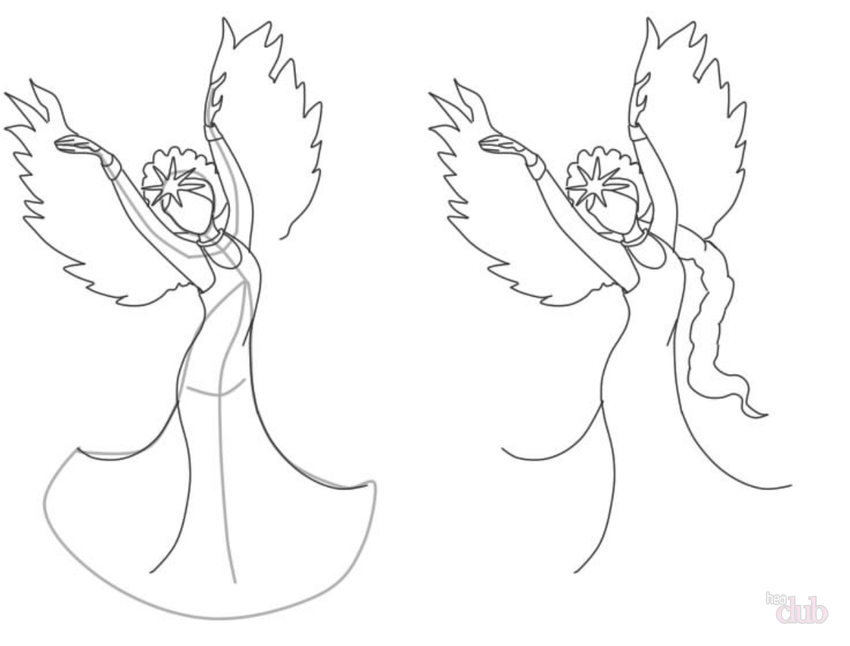 - Самый сложный этап в рисунке с царевной Лебедью – ее руки-крылья. Они красиво изогнуты и гибки. К рукам дорисовываются крылья, они располагаются как бы на заднем плане от рук. Крылья должны иметь несколько рядов перьев.