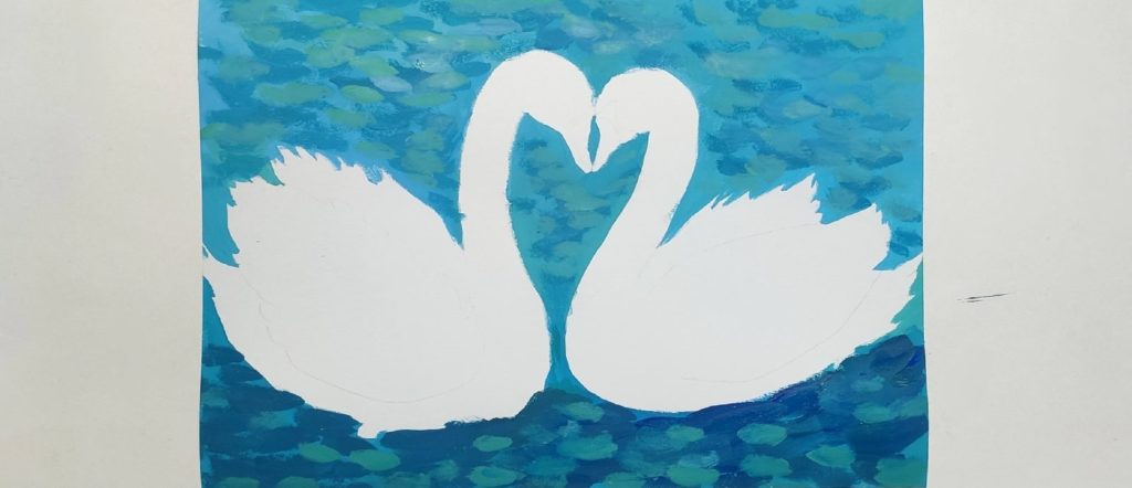 - Клювики лебедей “положите” на верхние края сердца. Нарисуйте легкие очертания воды.