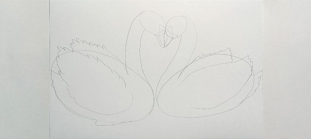 - Прорисуйте крылья лебедям, подняв их вверх, изображая своим видом “окрыленное сердце”. Округлите контур туловища, а под крыльями изобразите остренькие хвостики.