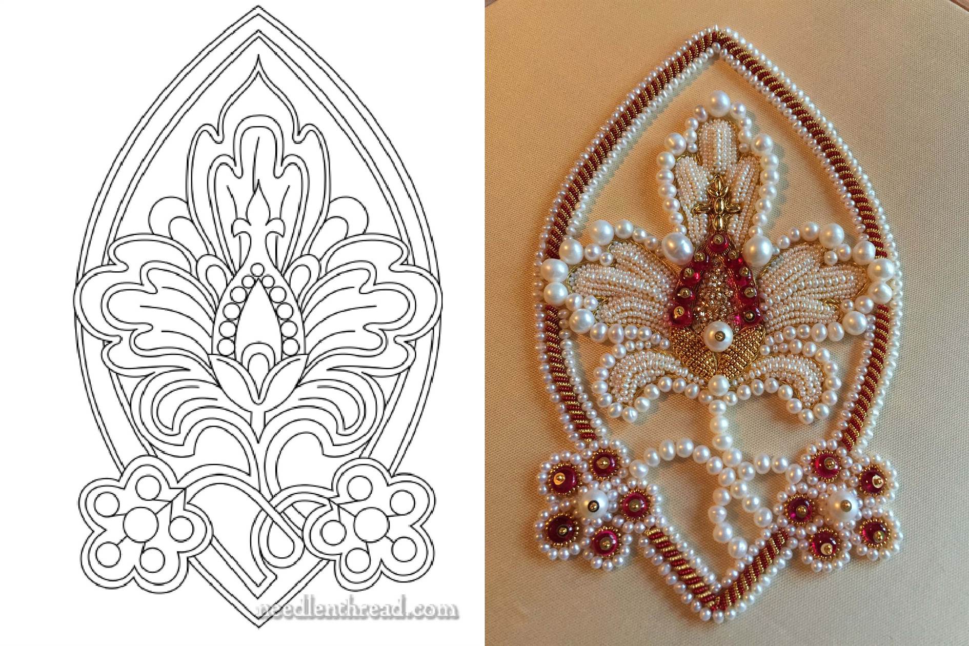 Мастерицы протаскивают крючком через основу нитку, образовывая цепочку декоративной вышивки. Старинная методика вышивания отличается применением золотых и серебряных нитей, бисера и камушков на просвечивающихся тонких тканях: шелке, батисте или же на плотных – бархате.