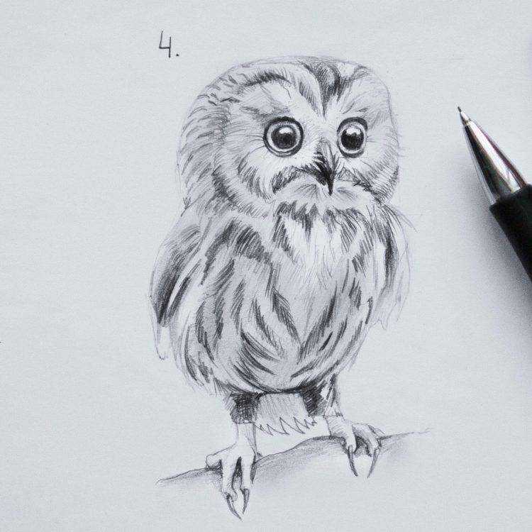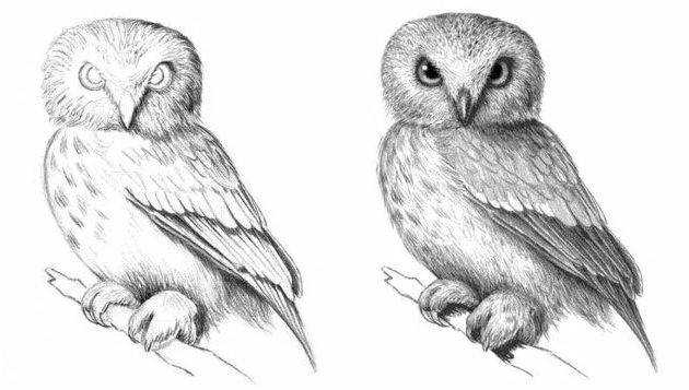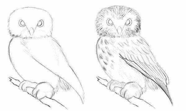 Лучше уточните все формы, почетче обозначьте переходы, прорисуйте перышки. После этого можно стирать ненужные линии, воспользовавшись ластиком. Когда вы избавитесь от лишних штрихов, покажите характер совиных глазок, добавьте больше детальности.