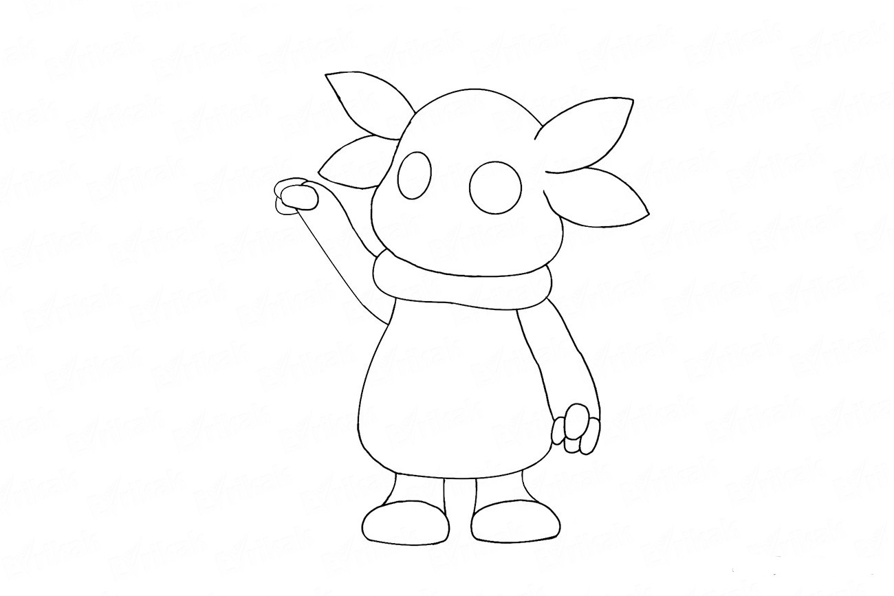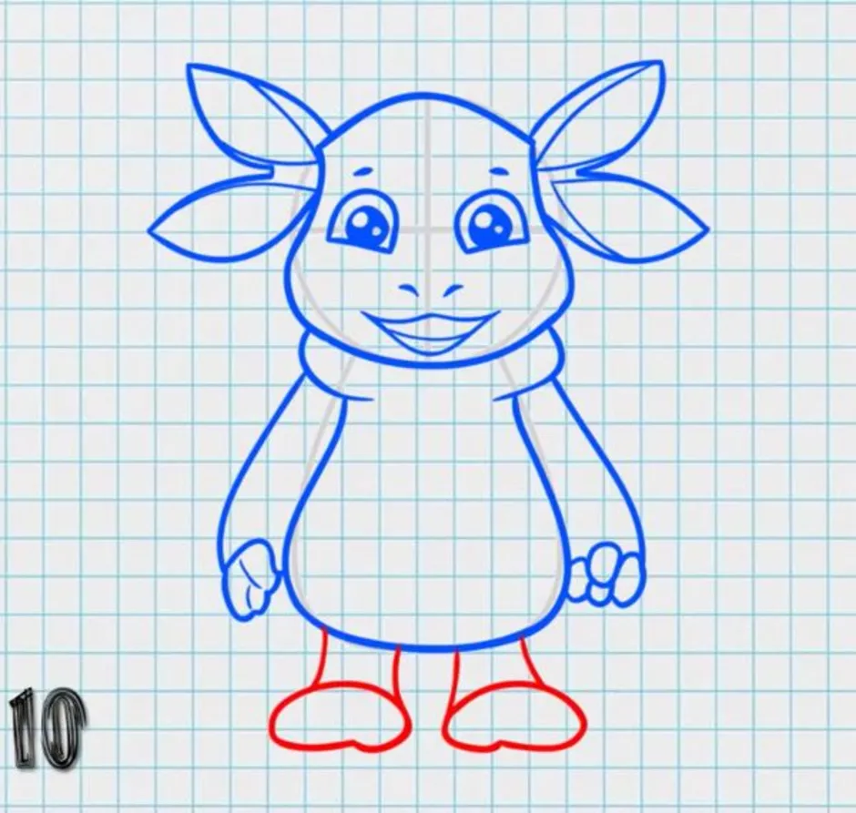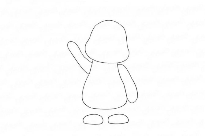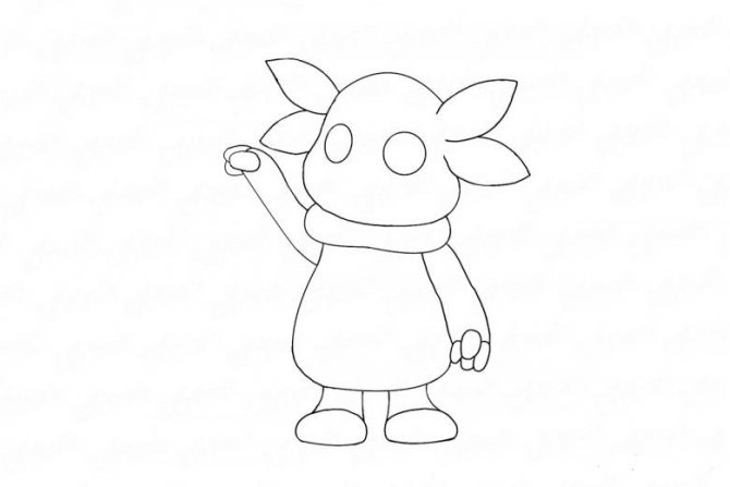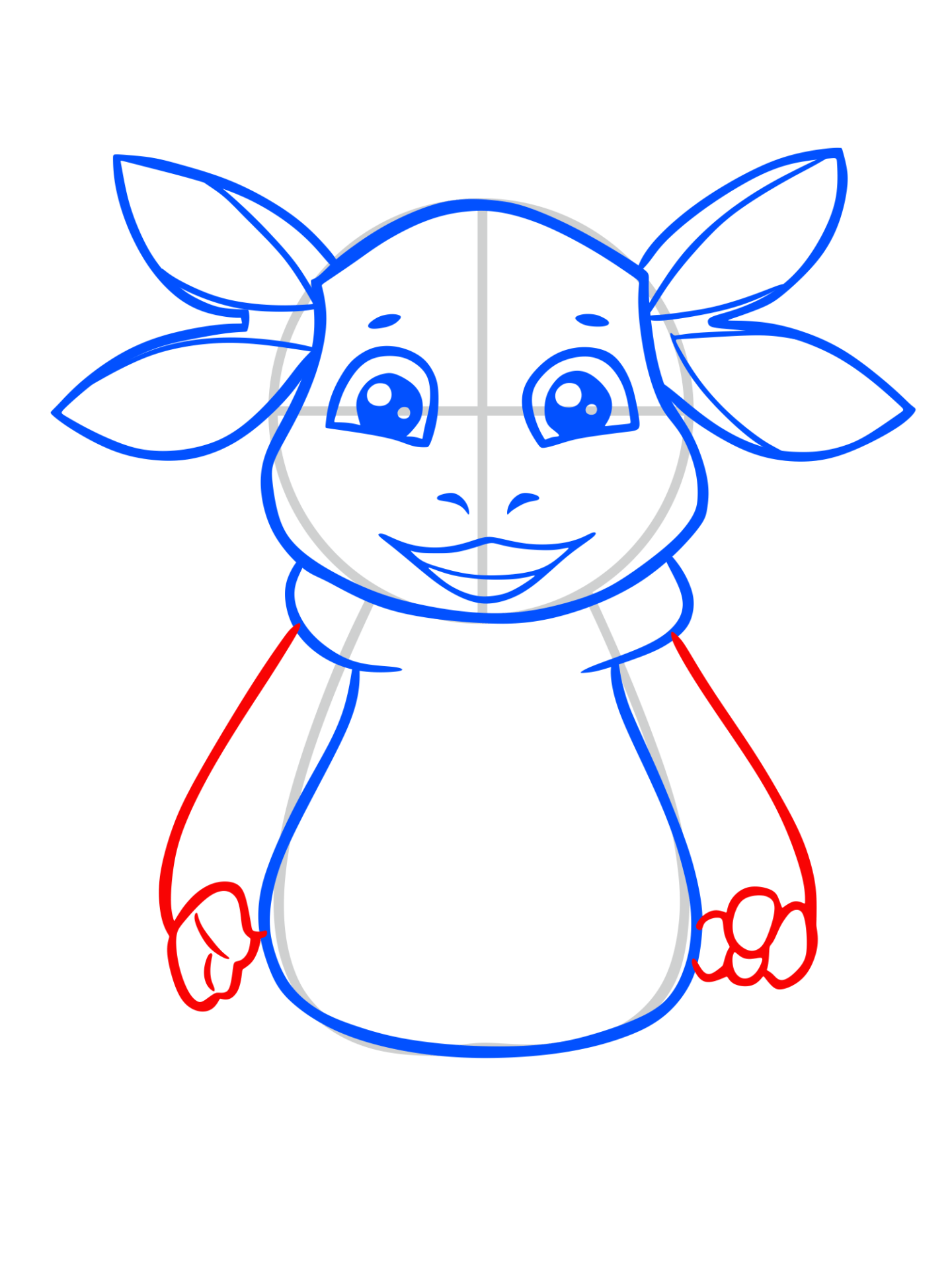 Не забудьте нарисовать руки и ножки. Руки должны быть короткими и заканчиваться ладошками, а ножки — тонкими и короткими.