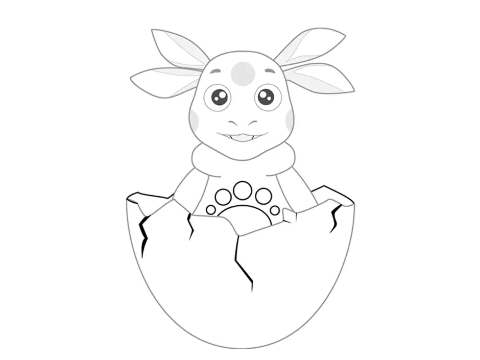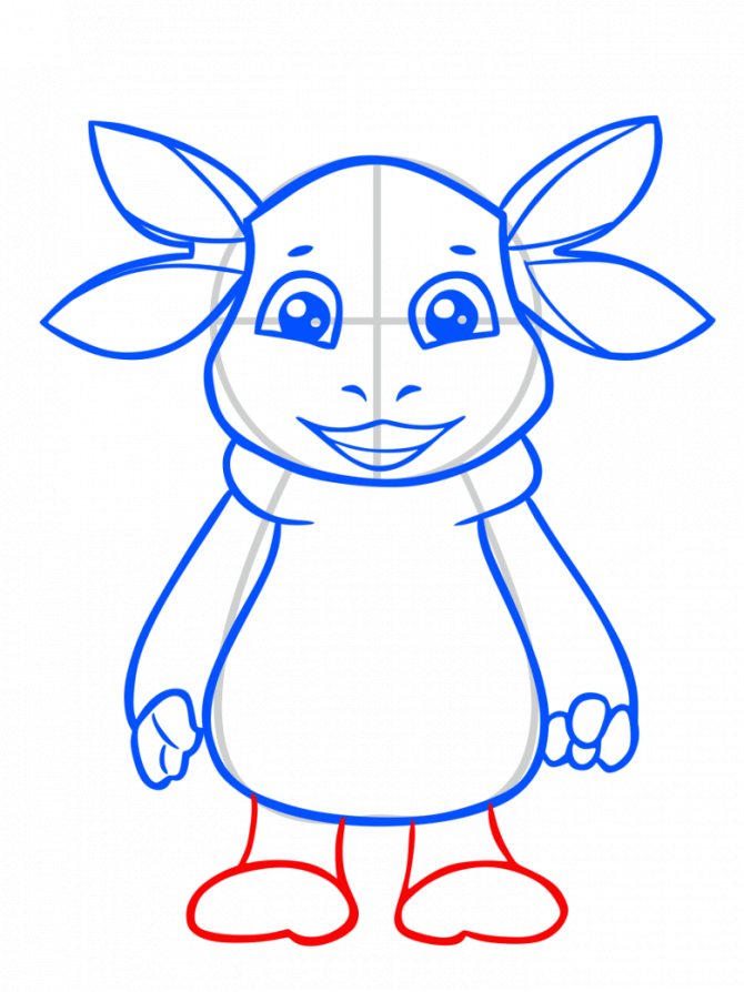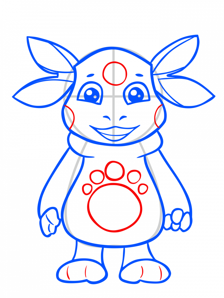 - Теперь займемся оформлением лица Лунтика. Нарисуйте большие искренние глаза чудо-зверька, открытую улыбку и носик.