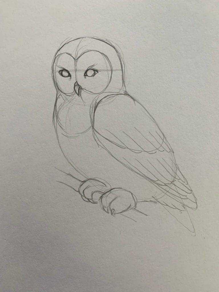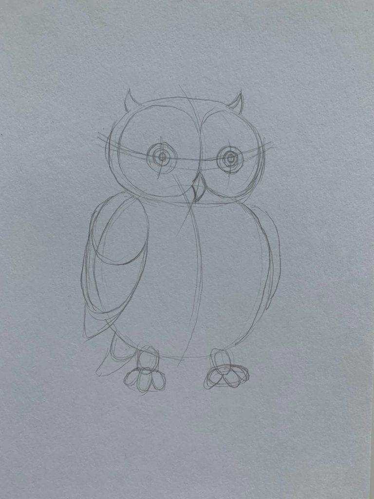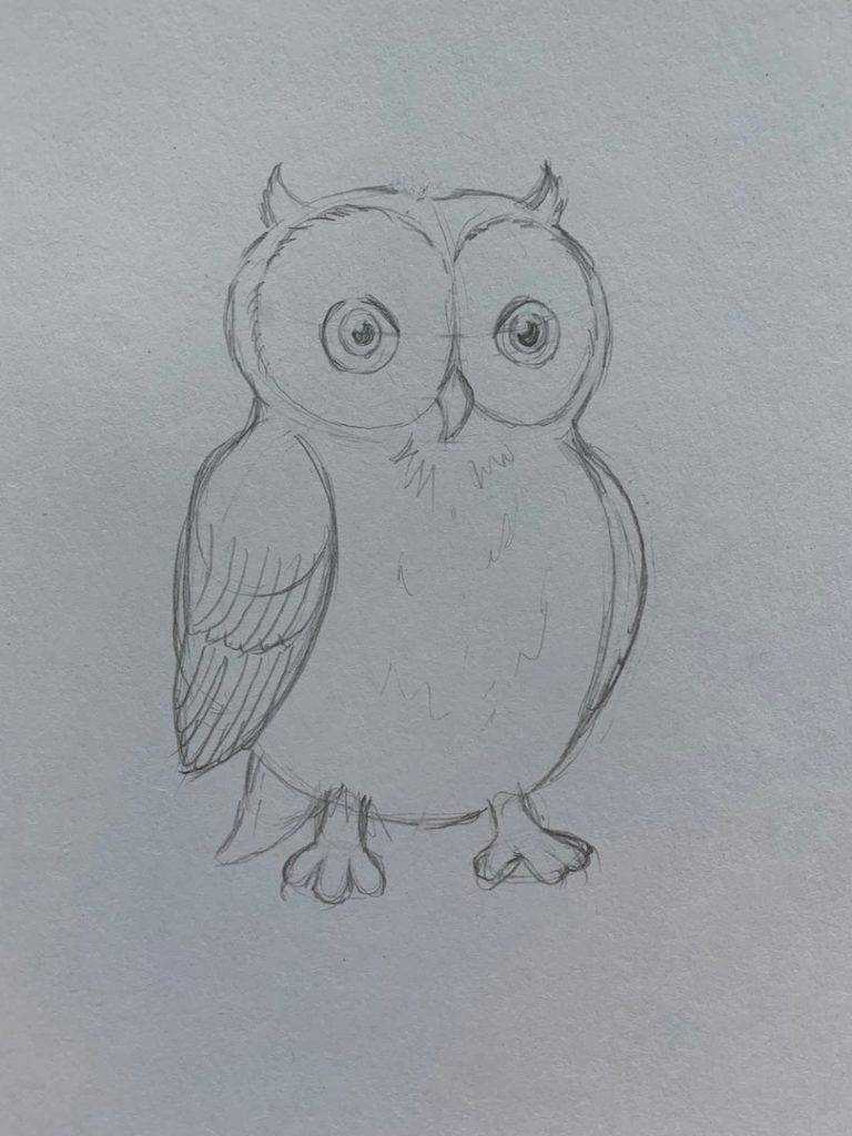 Придайте больше детальности получающейся птице. На этом этапе следует показать совиные ушки, пририсовать ей клюв, четче обозначить глазки и зрачки внутри них. Помимо этого, четче прорисуйте крыло. На лапах добавьте овалы пальчиков. Займитесь также и хвостом – его тоже необходимо прорисовать. Заднее крыло будет выглядывать из-за туловища совы, поэтому стоит показать его край. Крупными формами уточните светлую часть на совиной голове.