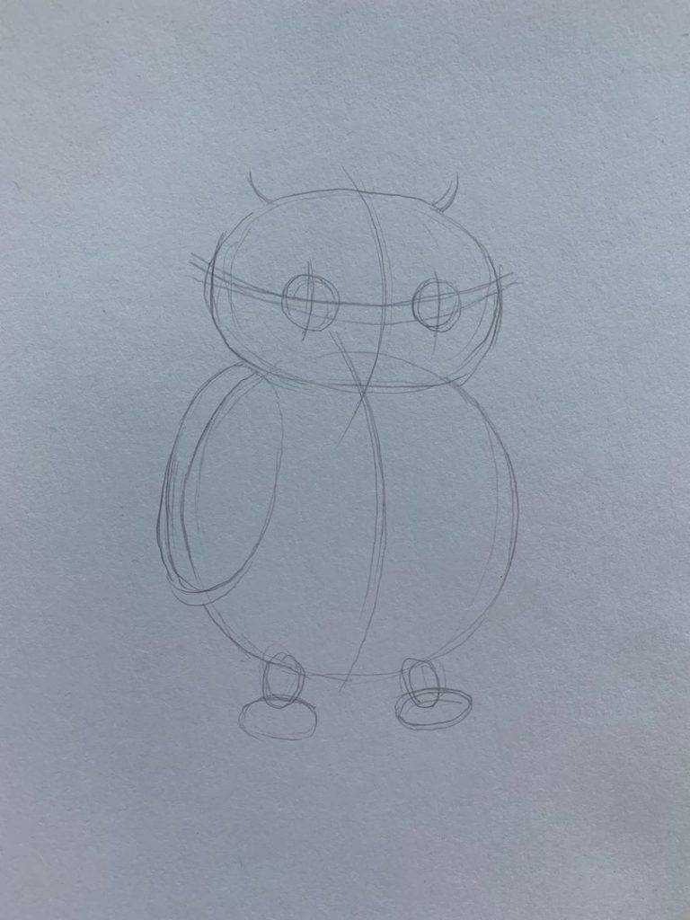 Второй шаг: прорисовка ушей, клюва, глазок и лапок