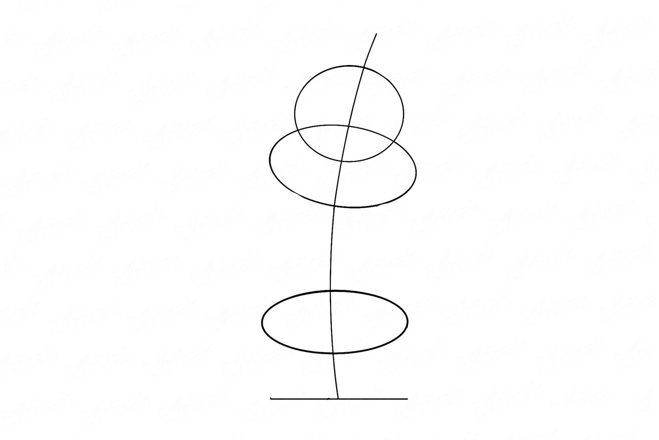 Затем проведите линию, проходящую через круг и овал. Эта прямая сыграет роль оси тела. Помимо нее следует обозначить совиную шею, соединив полукруглыми линиями голову с туловищем.