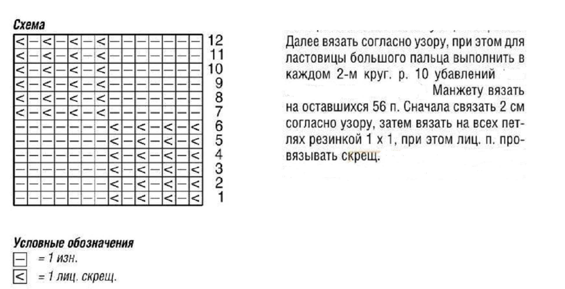 Ниже представлена схема вязания митенков без пальца на спицах: