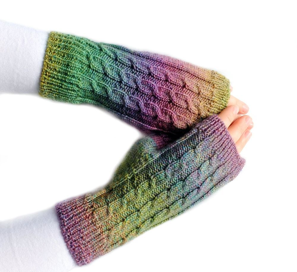Эти митенки, связанные спицами, просты в исполнении, поскольку вывязывать полотно для большого пальца здесь не придется.