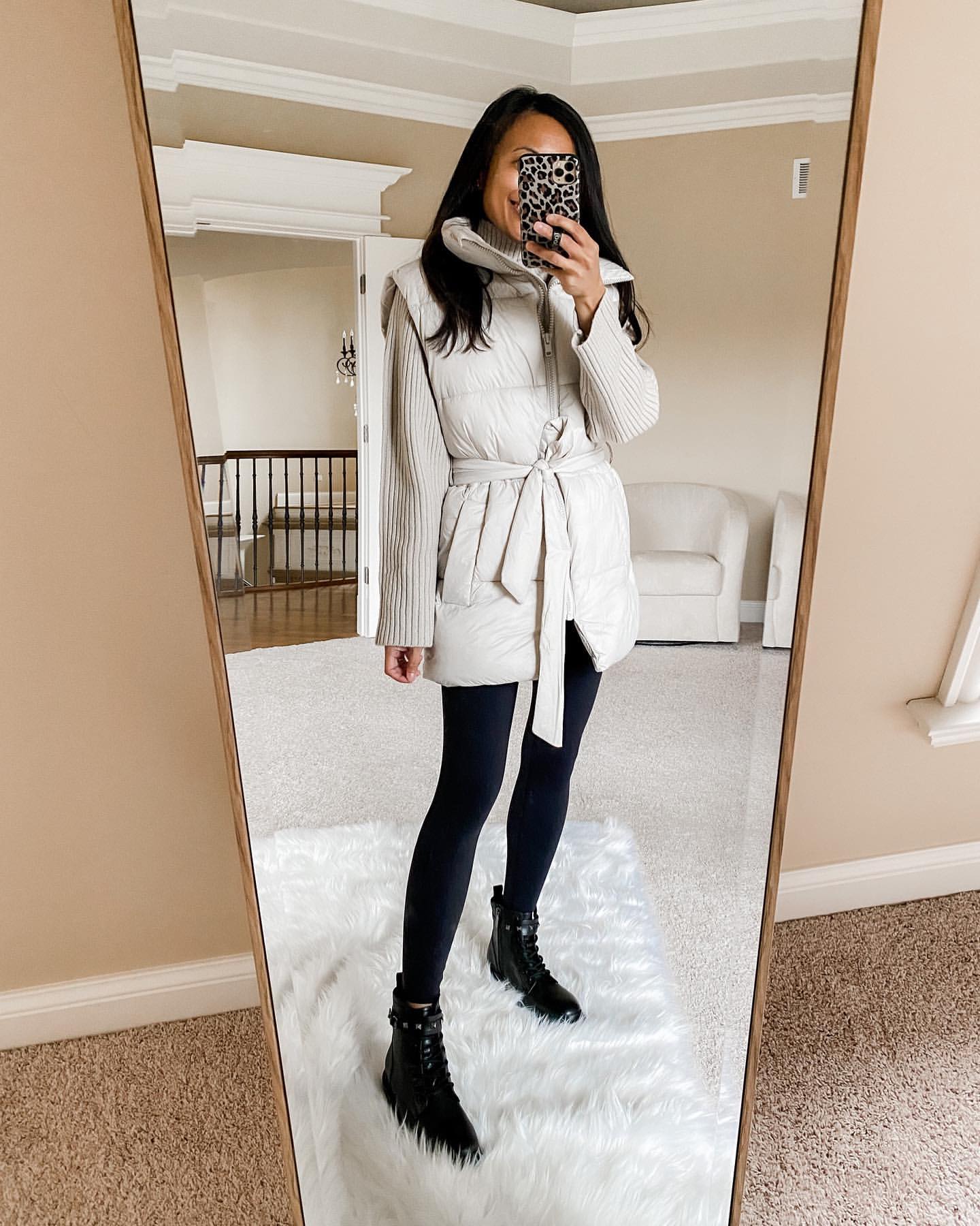 Классический вариант с леггинсами или скинни. Объемный джемпер oversize в паре с узкими брюками подчеркивает верх и придает образу непринужденность.