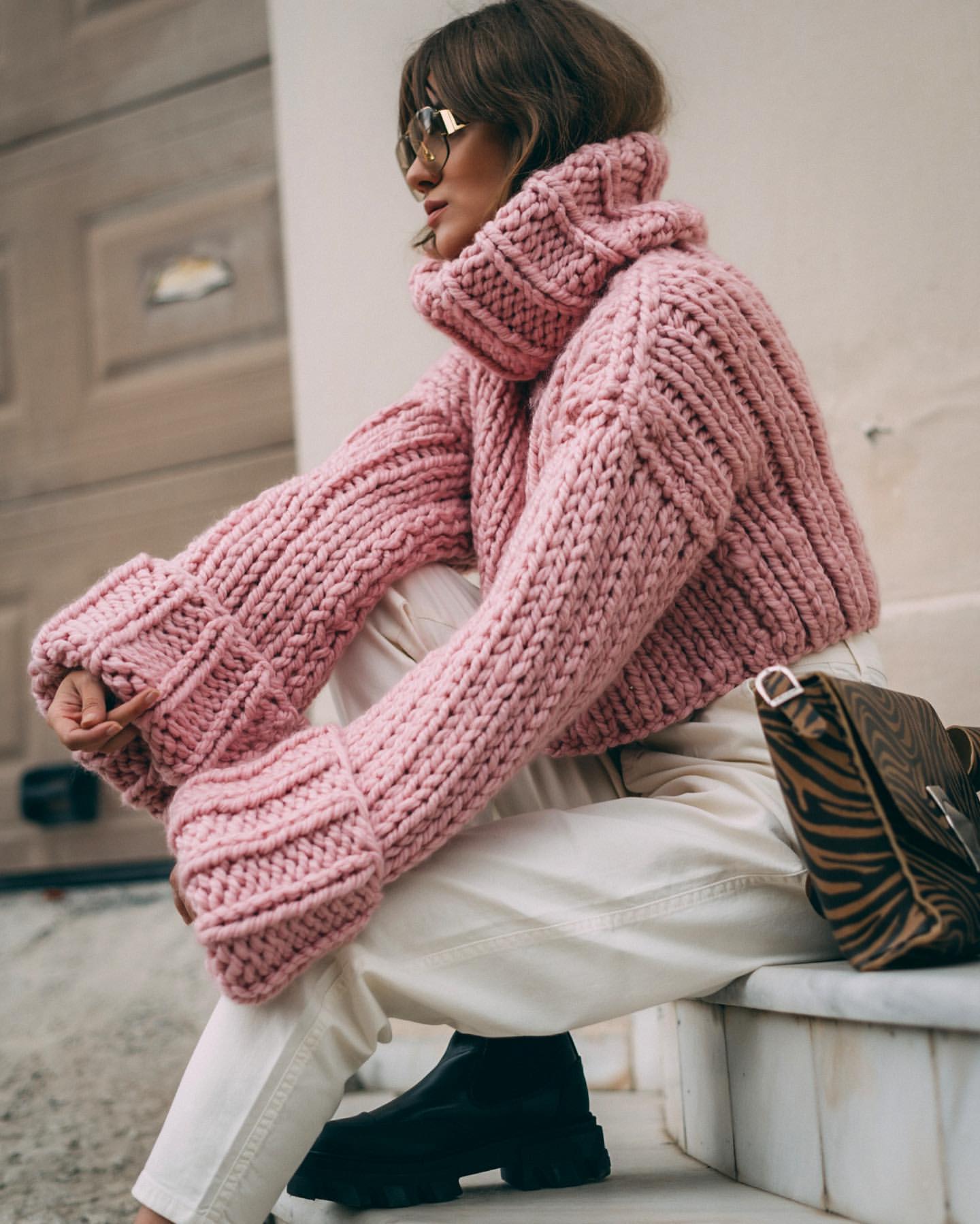 С наступлением первых осенних холодов стоит задуматься о приобретении максимально теплого шерстяного свитера из крупной вязки с согревающим высоким горлом. Сложно представить себе что-то более уютное и согревающее, чем огромный вязаный свитер из крупной вязки. Миксовать данное изделие можно с объемными стегаными куртками, вязаными шапками с отворотом, объемными варежками, громоздкими сапогами на плоской подошве, а также брюками из цветной кожи. Не утратить женственность и элегантность в подобной оверсайз модели свитера можно только с помощью грамотно подобранного низа, он не должен «сидеть» на фигуре чересчур вплотную, но в тоже время брюки модели палаццо также будут перебором.