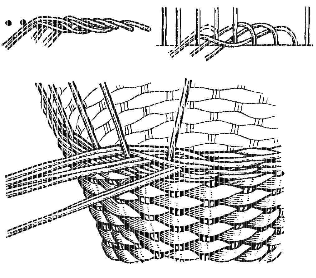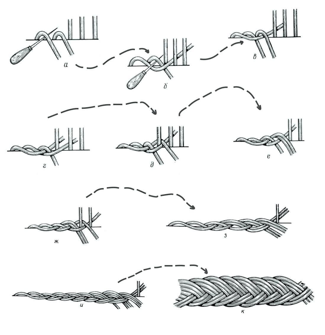 Для того, чтобы создать данный узор, следует разместить несколько стоек и закрепить их так, чтобы они не смещались при плетении. Двумя дополнительными лозами нужно оплетать стойки и переплетать между собой, плотно облегая прутики.