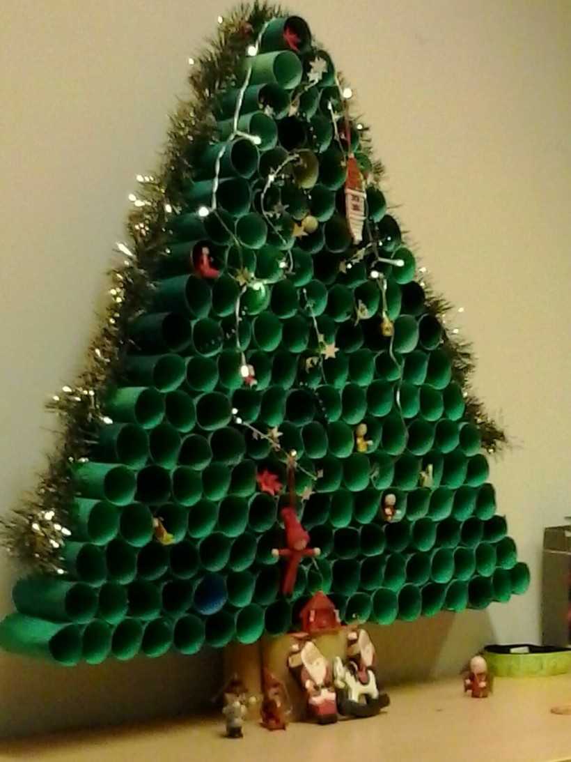 Из такого простого материала, как цилиндры от туалетной бумаги, можно сделать красивые праздничные ёлочки. Эти поделки сможет смастерить даже ребёнок. Вот пример такой поделки: