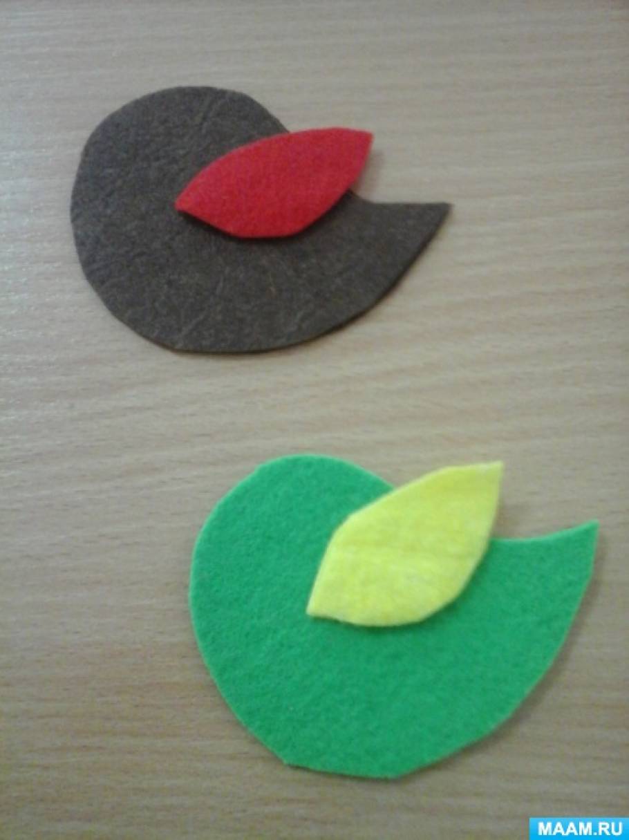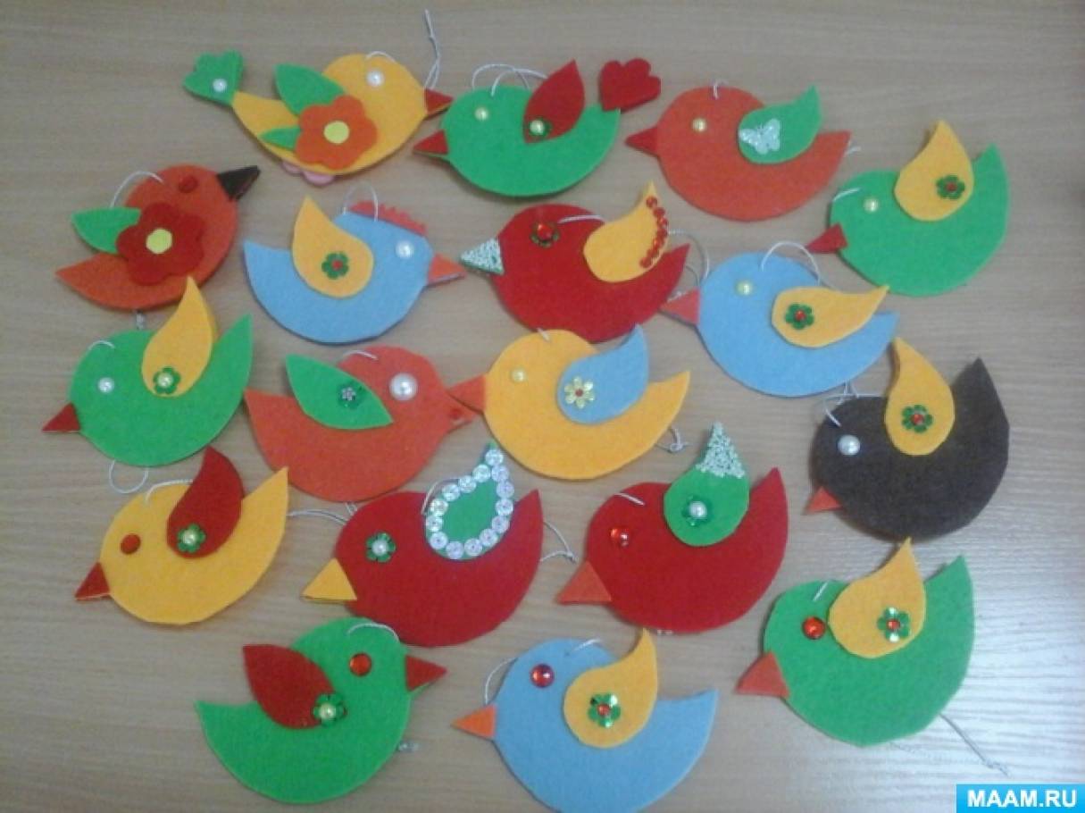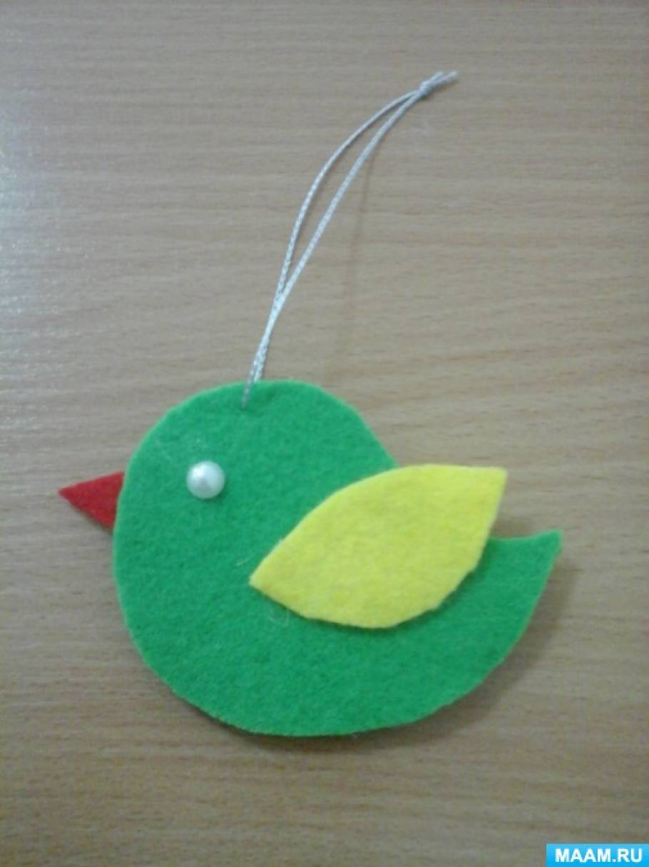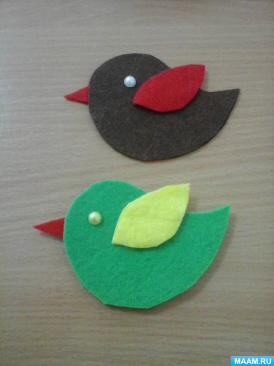 - Птичка из фетра. Для изготовления такой поделки нужен фетр разных цветов, нитки и ножницы. Нужно нарисовать на фетре контур птицы, вырезать его и прикрепить нитками к другой части фетра. Затем нужно вырезать контур птицы из второго куска фетра и прикрепить его к первому, сшив нитками.