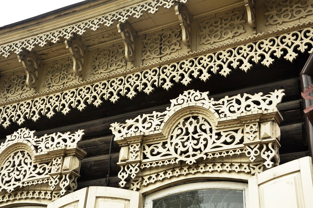 Активно применяется для декоративного оформления экстерьера домов с помощью различных орнаментов и фигур на деревянных элементах. Таким методом могут декорировать любые выступающие и накладные детали фасадов домов: карнизы, наличники, балясины, лемеха кровли, столбы крыльца.