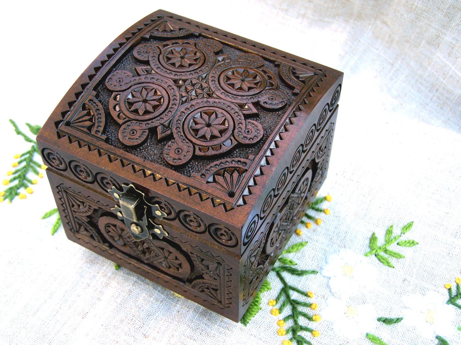 Особым видом можно выделить рисунки для шкатулок. Их можно выполнить в различных техниках: прорезной резьбой, подкладывая под рисунок основу из ткани, фольги или благородных сортов дерева подходящего цвета; плосковыемчатой резьбой, к которой относятся геометрическая и контурная, или другим подвидом. Отличается она тем, что в плоском фоне проделываются углубления на одинаковую глубину. В случае с геометрической техникой углубления, как правило, имеют форму треугольников или четырехугольников. Кроме этого, есть еще скобчатая резьба, которая тоже является разновидностью плосковыемчатой и хорошо подходит для оформления шкатулок. На изображениях можно видеть шкатулки, выполненные в различных стилях.