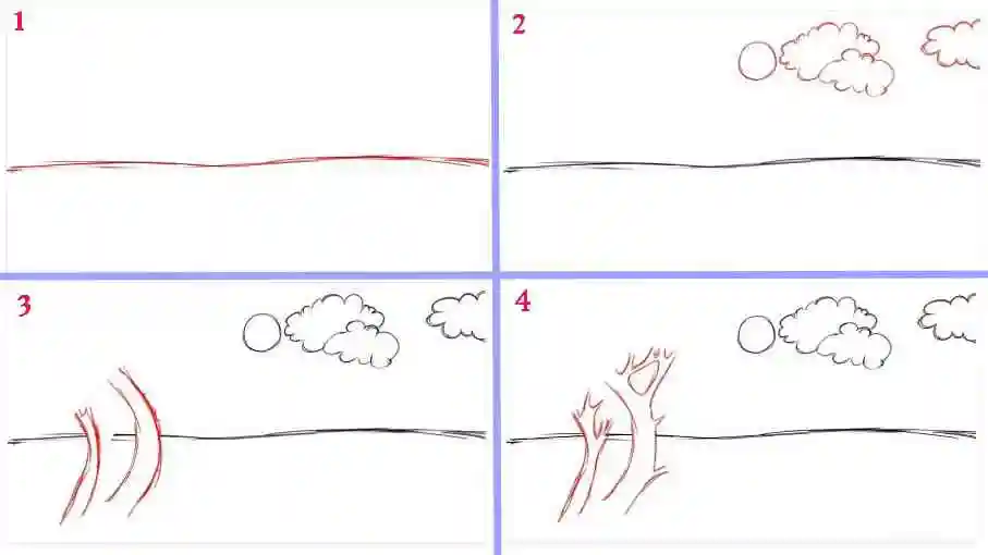 1. Обозначается линия горизонта. 2. Над ней рисуем солнышко и облака. 3. На переднем плане с одной стороны листа разместим изогнутые линии это будут стволы будущих деревьев. 4. Теперь дорисовываем ветви к стволам.