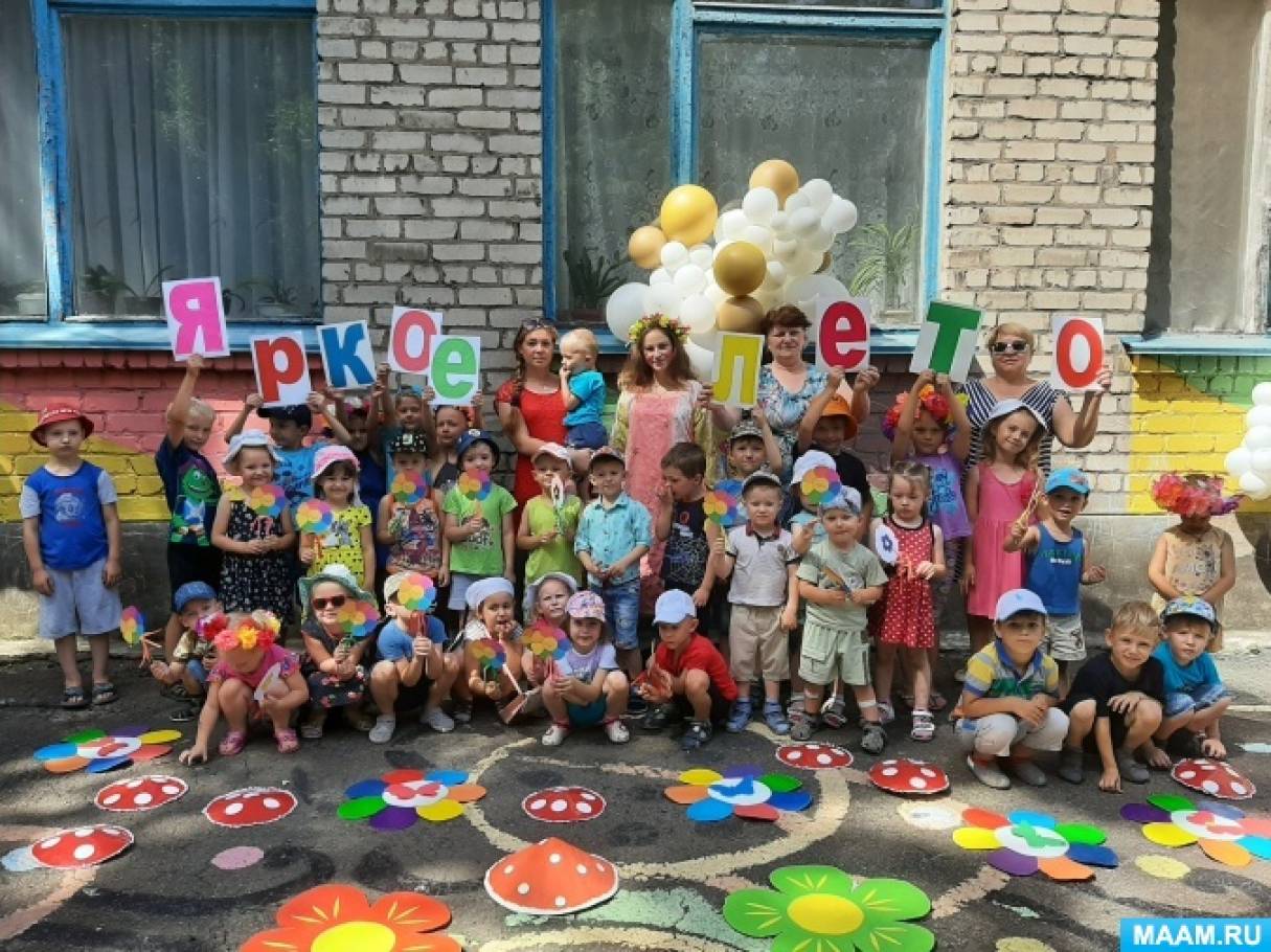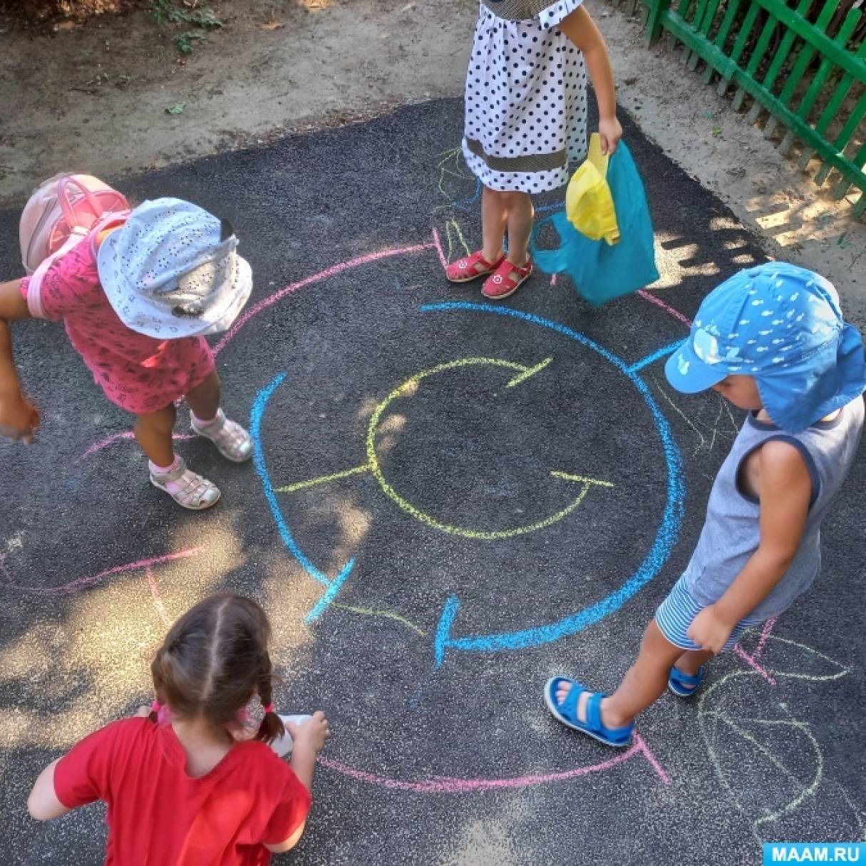 Для проведения это мероприятия в летний августовский день, мною была выбрана площадка, на ней дети создавали свои «разноцветные шедевры».