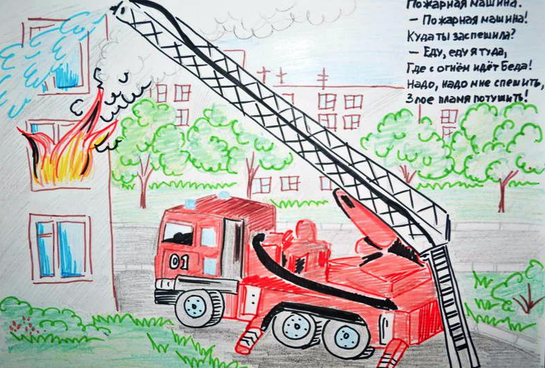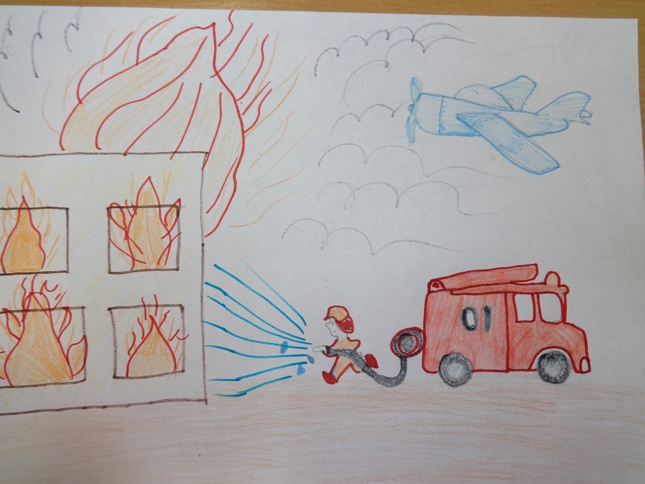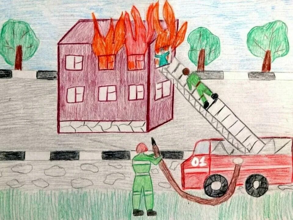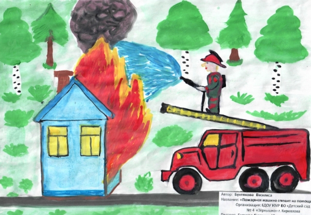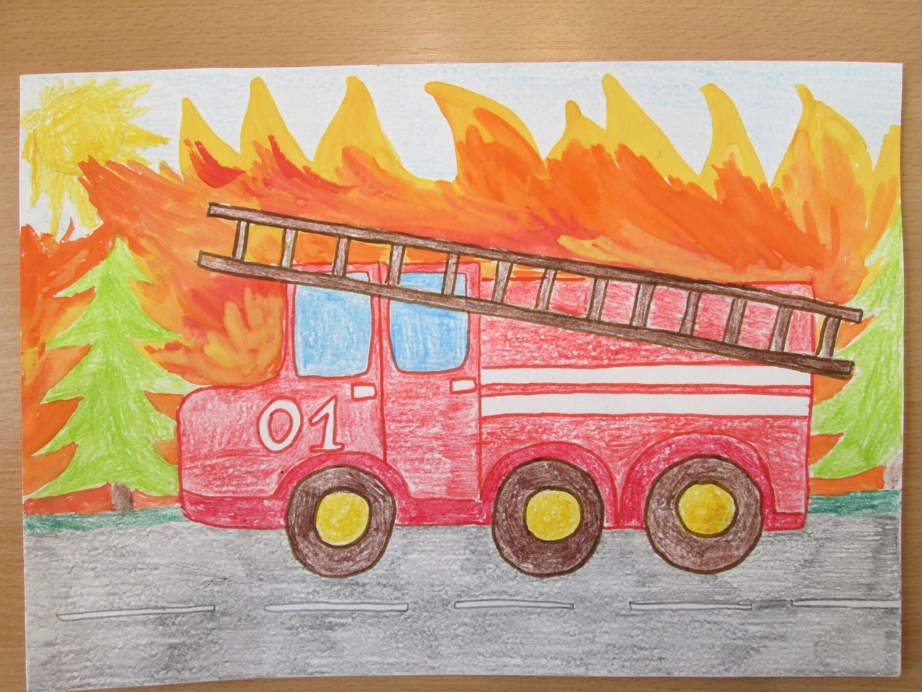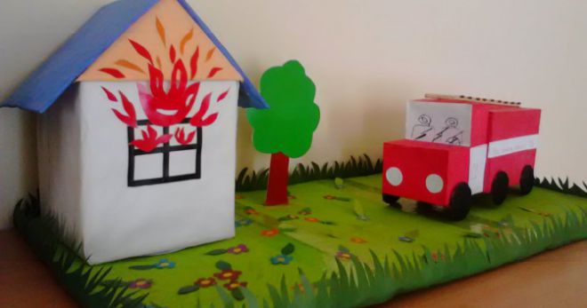 Из бумаги можно склеить и простые композиции. На твердом основании (картон, фанера) создается зеленый фон. Деревенский дом делается из бумаги. На нем рисуются или приклеиваются окна и двери из цветной бумаги, а также языки пламени, вырывающиеся из окна. Поделка закрепляется на основании. Аналогично делается небольшая пожарная машина.