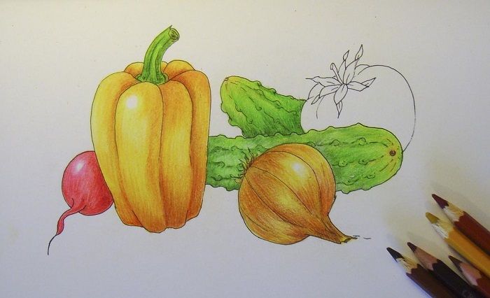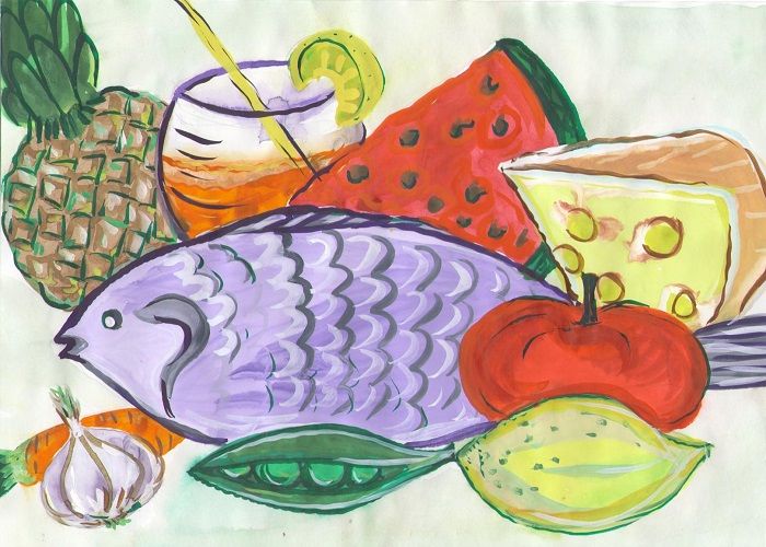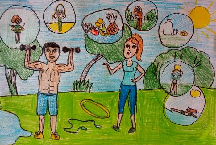 При выполнении простого изображения по заданной тематике дети рисуют одну из составных частей ЗОЖа. Например, рацион правильного питания, занятия спортом и физкультурой, дневной распорядок. Простые рисунки выполняют дети из старшей группы детского сада, ученики 1 или 2 класса.