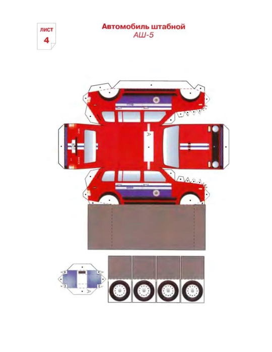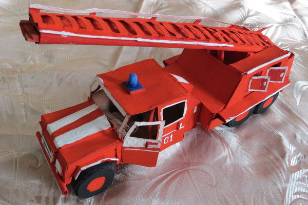 С помощью взрослых легко сделать поделку из бумаги в технике паперкрафт. Для этого потребуется плотный лист бумаги. На нем чертится и раскрашивается разворот машины. На фото показана схема штабной пожарной машины. Заготовка аккуратно вырезается ножницами, а детали сгибаются в нужных местах, склеиваются по отворотам, и поделка готова.