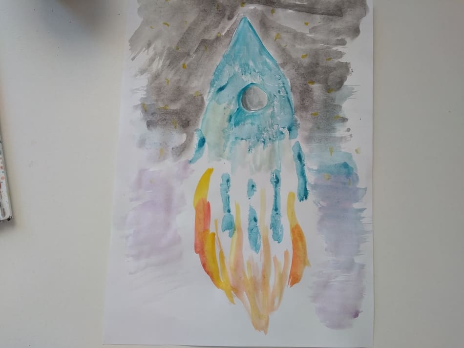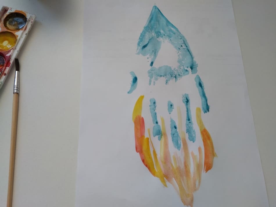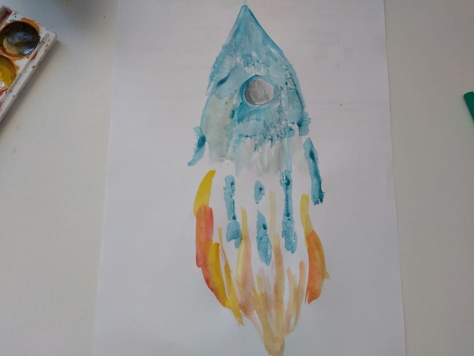 У дошкольников активно развивается мелкая моторика. Мы много рисуем ими пальцами, играем крупами и так далее, поэтому предлагаю изобразить ими ракету. Но не простой, а созданный на основе детской ладошки.