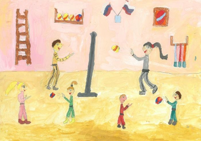 Здесь изображают, как дети занимаются спортом, играют в подвижные игры, танцуют, бегают. Обычно рисуют безопасные или малотравматичные виды спорта: прыжки, футбол, баскетбол. Не стоит изображать фристайл, бои без правил и другие экстремальные физические нагрузки.
