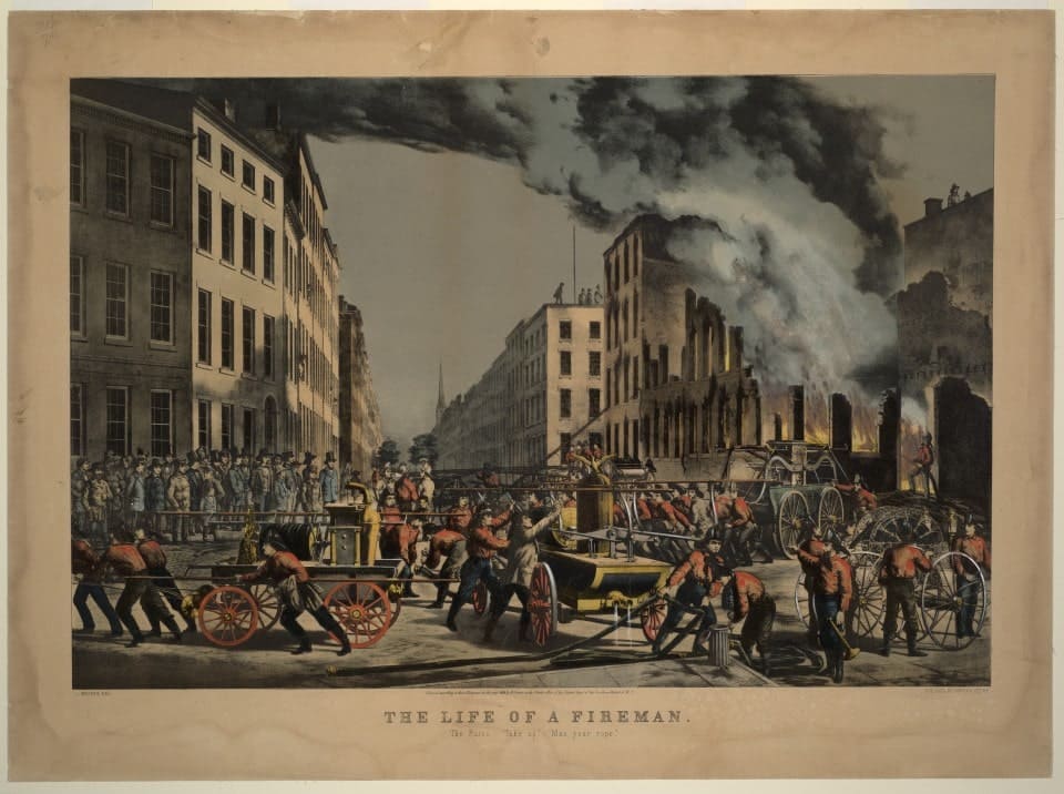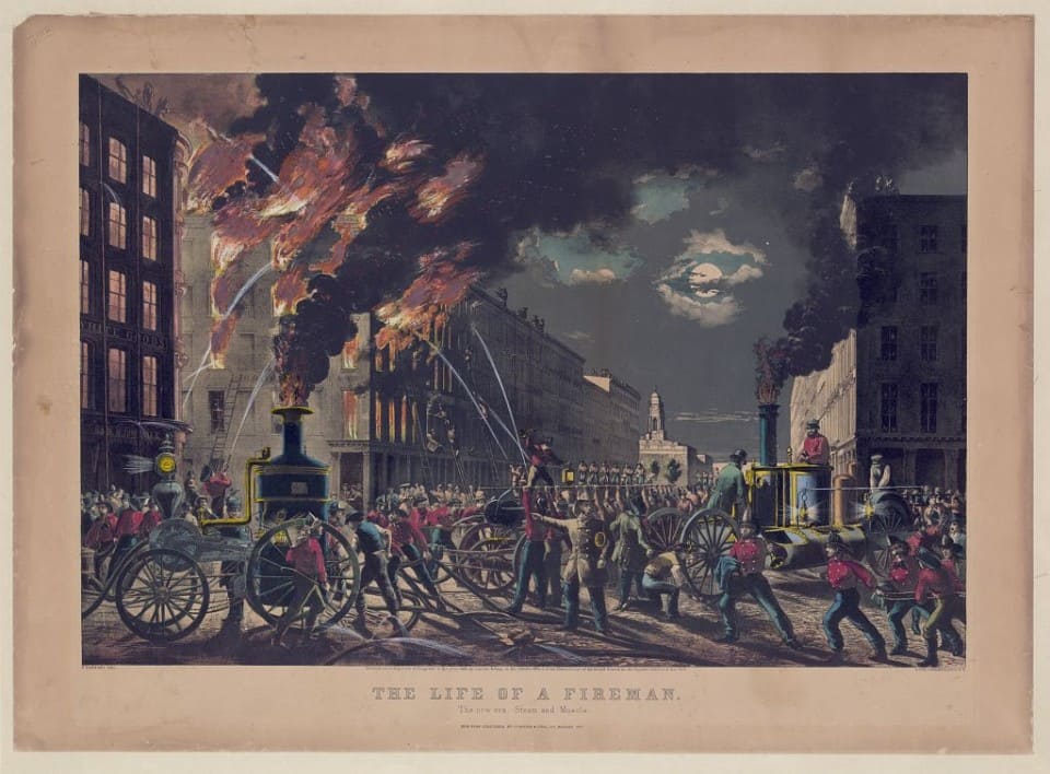 Серия гравюр “Американский пожарный” (The American Fireman). Лицом к врагу (Facing the enemy). Луис Маурер, 1858 год.