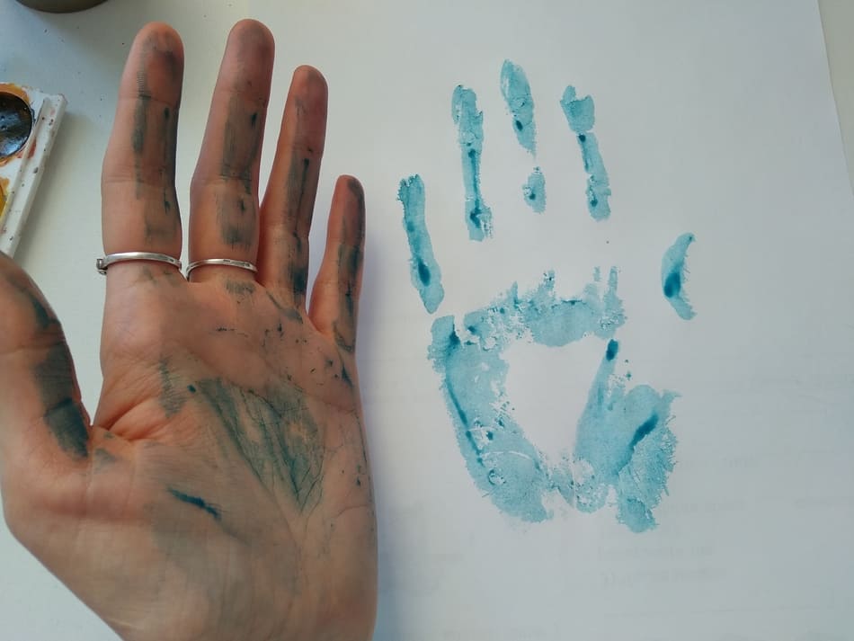 Берем пальму и раскрашиваем голубой акварелью. Делать это нужно быстро, чтобы краска не успела высохнуть. Переверните ручку и сделайте отпечаток руки в центре бумаги.