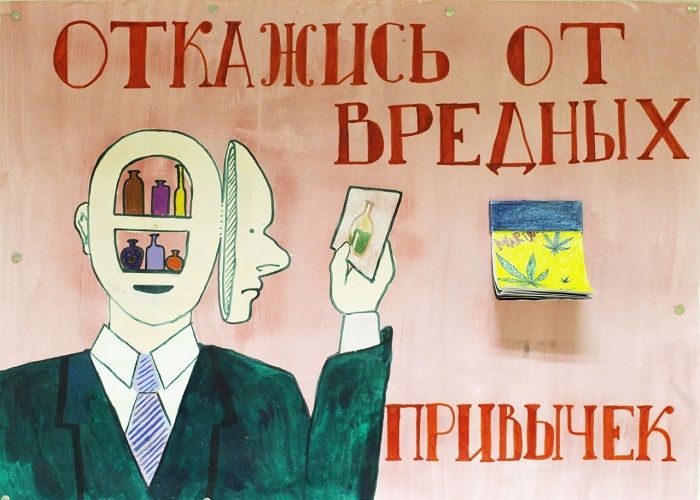 Можно изобразить прокуренного, кашляющего человека, подписав: «Загубленная красота». Или нарисовать пьющего алкоголика, подписав: «Как твое здоровье? Бросай пить, друг!»