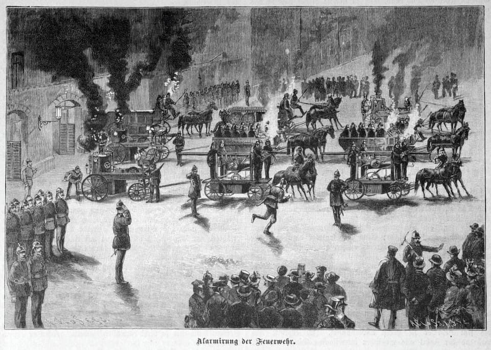 Немецкая гравюра “Пожарная тревога”, 1888 год.