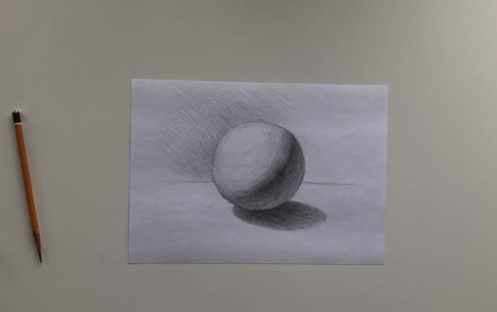 Полностью заштриховываем наш шар, закругленными штрихами. Заштриховываем падающую тень, горизонтальными и диагональными штрихами. Под самим шаром мы делаем тоновой акцент, для того, чтобы показать прикосновение нашего шара со столом.