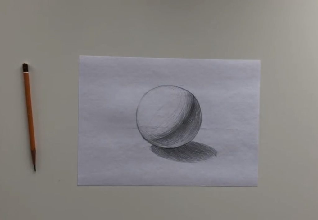 Еще сильнее набираем тон на шаре. Также к полукруглому штриху вводим диагональный штрих. Диагональным штрихом мы показываем переход от собственной тени к полутону. Это нужно для того, чтобы переход стал чуть мягче и появился новый вид штриха. Так мы еще сильнее утемняем шар. Далее утемняем падающую тень, штрих в том же направлении, который был у нас изначально. Немного добавляем фон со световой стороны шара. Фон стараемся сильно не штриховать, чтобы он был светлее, чем падающая и собственная тень. Падающая тень должна быть немного темнее, чем собственная тень на шаре.
