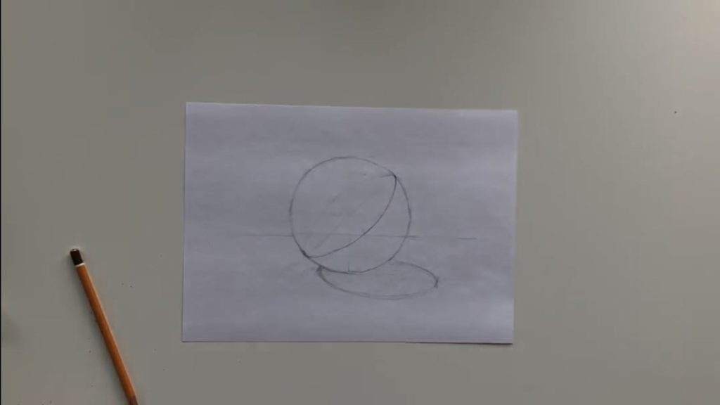 В отличии от других объемных фигур контурный рисунок шара не демонстрирует его объема. Например, в кубе контуры граней своим расположением и направлением указывают на наличие в кубе объема. Чтобы выявить объем в шаре, его нужно мысленно построить, а затем отобразить построение в рисунке. Без этого построения нанести грамотно тени будет затруднительно. Итак, приступим.